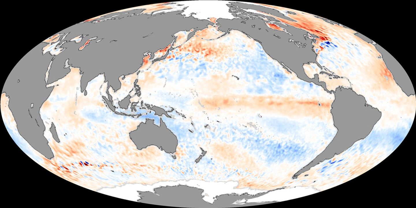 Periodically the trade winds will slow or even reverse directions so that warm water is no longer pushed west. The western Pacific cools, while the eastern Pacific warms. This distinctive reversal in the Pacific’s temperature pattern is called El Niño. (The name, Spanish for “boy child,” arose because the pattern often becomes obvious around Christmas.) Satellite measurements of sea surface temperatures in the tropical Pacific revealed a clear El Niño pattern in November 2006. Warmer-than-average sea surface temperatures, shown in red, stretch away from the South American coast, while cooler-than-average temperatures (blue) pool around Indonesia and Australia. The image is based on satellite observations collected in November 2006 by Japan’s Advanced Microwave Scanning Radiometer for the Earth Observing System (AMSR-E) that flies on NASA’s Aqua satellite. Those observations are compared to long-term average conditions observed by the Advanced Very High Resolution Radiometers (AVHRRs) on a series of NOAA (National Oceanic and Atmospheric Administration) satellites that flew between 1985 and 1997.