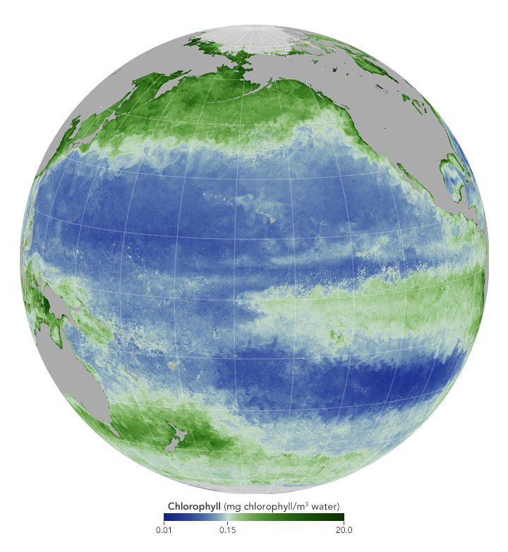The globes above compare sea surface chlorophyll in the Pacific Ocean as observed in October 2014 and 2015. Both images are derived from data acquired by the Moderate Resolution Imaging Spectroradiometer (MODIS) on NASA’s Aqua satellite. Shades of green indicate more chlorophyll (in milligrams per cubic meter) and blooming phytoplankton. Shades of blue indicate less chlorophyll and less phytoplankton. Turn on the image comparison tool to see the subtle changes in concentrations.