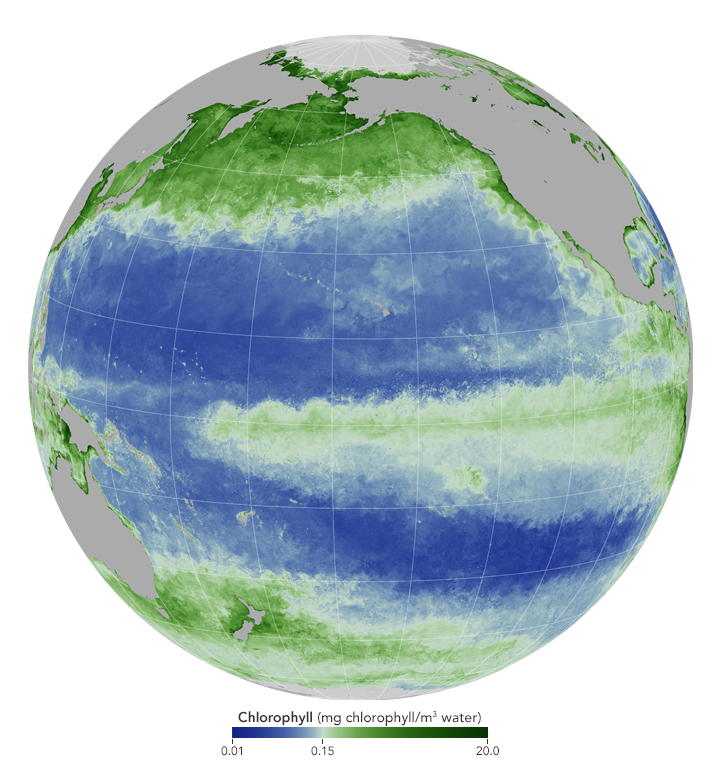The globes above compare sea surface chlorophyll in the Pacific Ocean as observed in October 2014 and 2015. Both images are derived from data acquired by the Moderate Resolution Imaging Spectroradiometer (MODIS) on NASA’s Aqua satellite. Shades of green indicate more chlorophyll (in milligrams per cubic meter) and blooming phytoplankton. Shades of blue indicate less chlorophyll and less phytoplankton. Turn on the image comparison tool to see the subtle changes in concentrations.