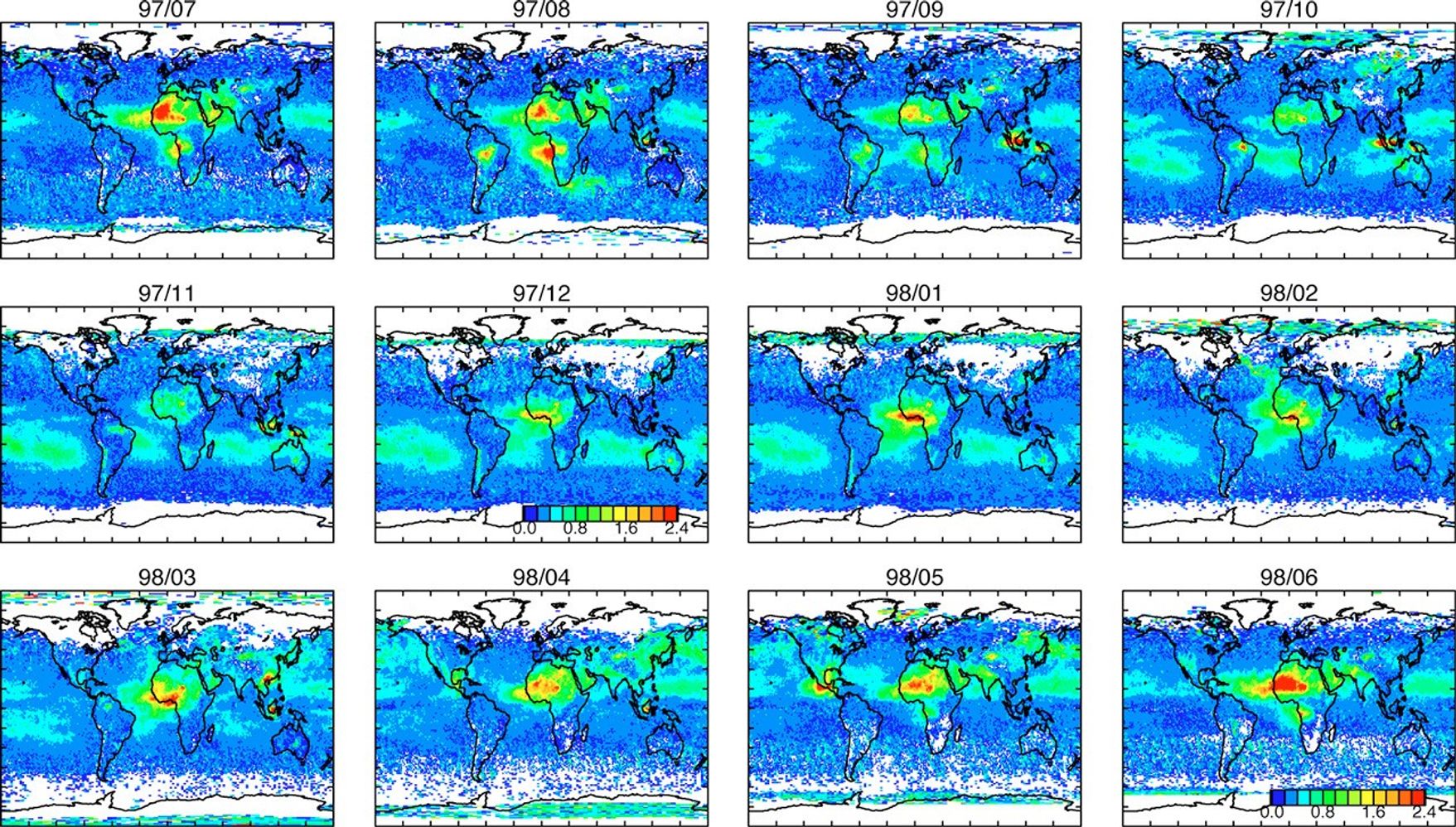 The images above show the amount of absorbing aerosols [tiny dark particles (like soot) suspended in the atmosphere] in the air around the world in 1997 and 1998. Blue colors indicates very little absorbing aerosols, and the orange and red colors indicate a high concentration of them. The aerosols over Indonesia were particularly thick during the wildfires that raged there during September and November 1997. Burning in Africa and Brazil also produced aerosols visible in these images. The high Aerosol Index values in Northern Africa are caused by dust blowing off the Sahara desert, and not fires.