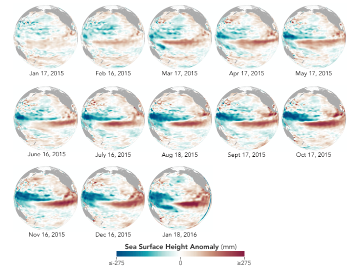 The data maps above compare sea surface heights in the Pacific Ocean as measured by NASA on January 17, 2015, before the event began, and on January 18, 2016. Note that the January 2015 map shows remnants of a weak 2014 El Niño event that kick-started the intense 2015–2016 event. The maps below show conditions in the middle of each of the past 13 months as El Niño has developed.