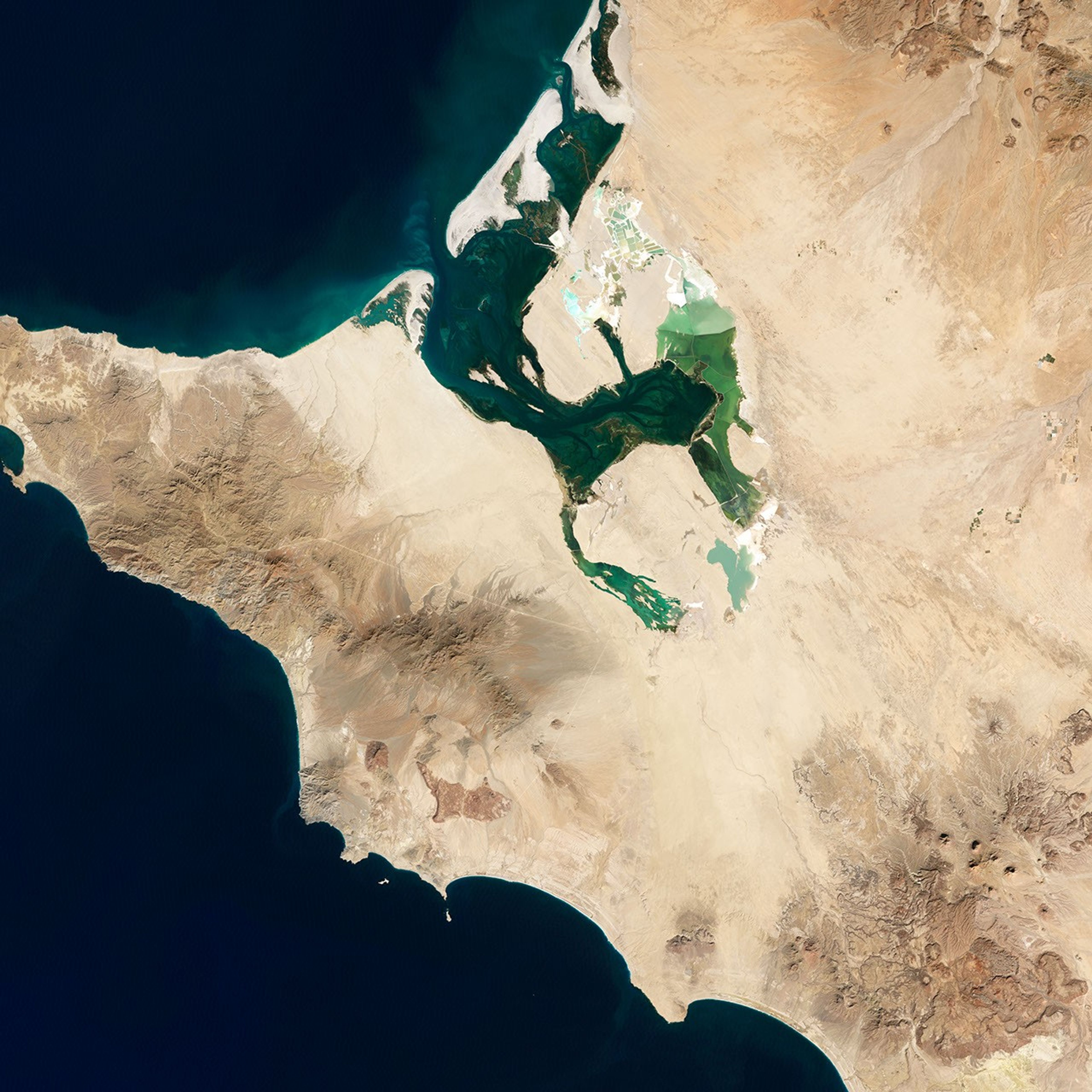 This image also shows evidence of human activity. Some of the clearest green areas in this image result not from lush vegetation but from salt extraction. Along the edges of Lago Ojo de Liebre and near the town of Guerrero Negro, a massive salt mine produces roughly seven million tons of salt each year. The salt works contrast with their surroundings thanks to their rectangular outlines and green hues.