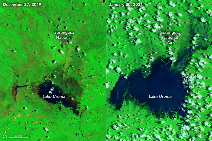 These images show flooding on January 30, 2021, seven days after Eloise made landfall near the coastal city of Beira. The images from December 2019 are provided to compare the area under non-flooded conditions in the same season. The false-color images, acquired by the Operational Land Imager (OLI) on Landsat 8, use a combination of visible and infrared light (bands 7-5-3) to help differentiate flood water (dark blue), bare land (brown), and vegetation (bright green).