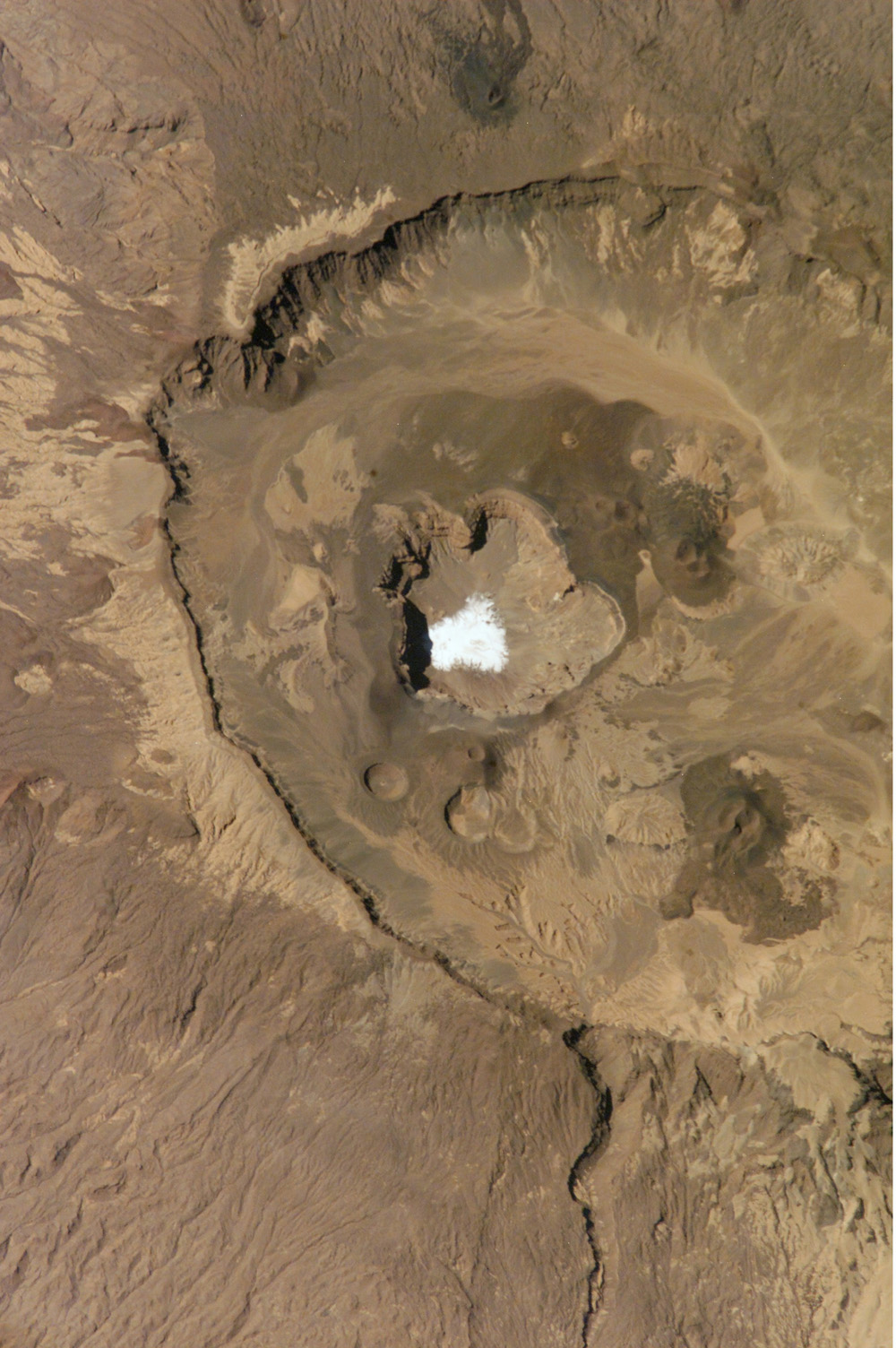This view of the Emi Koussi caldera was taken with an 800 mm lens on November 11, 2002. It is detailed to the point that it doesn’t include the entire 10-km diameter of the caldera, but reveals individual lava strata within the walls of the summit cliffs. Nested within the main caldera is a smaller crater that contains white salts of a dry lake at its lowest point. Here too, strata are visible in the walls of the smaller crater. The smaller crater is surrounded by a region of darker rocks—a geologically young dome of lava studded with several small circular volcanic vents.