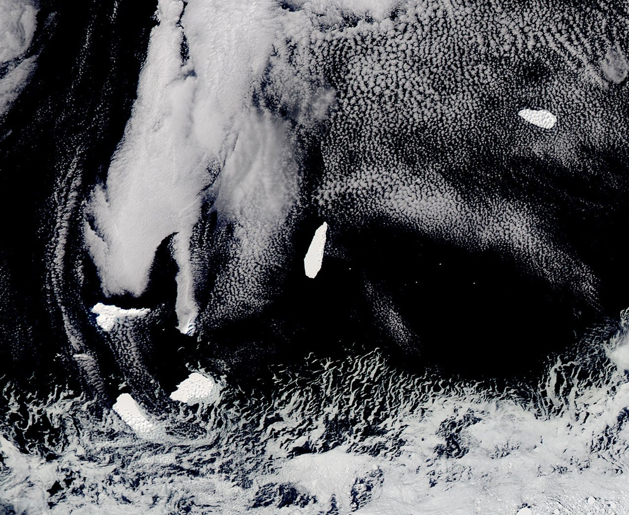 Four icebergs of various sizes and ages are visible in this image of the Southern Ocean, near the Weddell Sea (south) and the Drake Passage (north). It was acquired on October 20, 2017, by the Moderate Resolution Imaging Spectroradiometer (MODIS) on NASA’s Aqua satellite. The fifth white feature in the image looks like an iceberg but is, in fact, a piece of land—Elephant Island—buried under snow and ice.