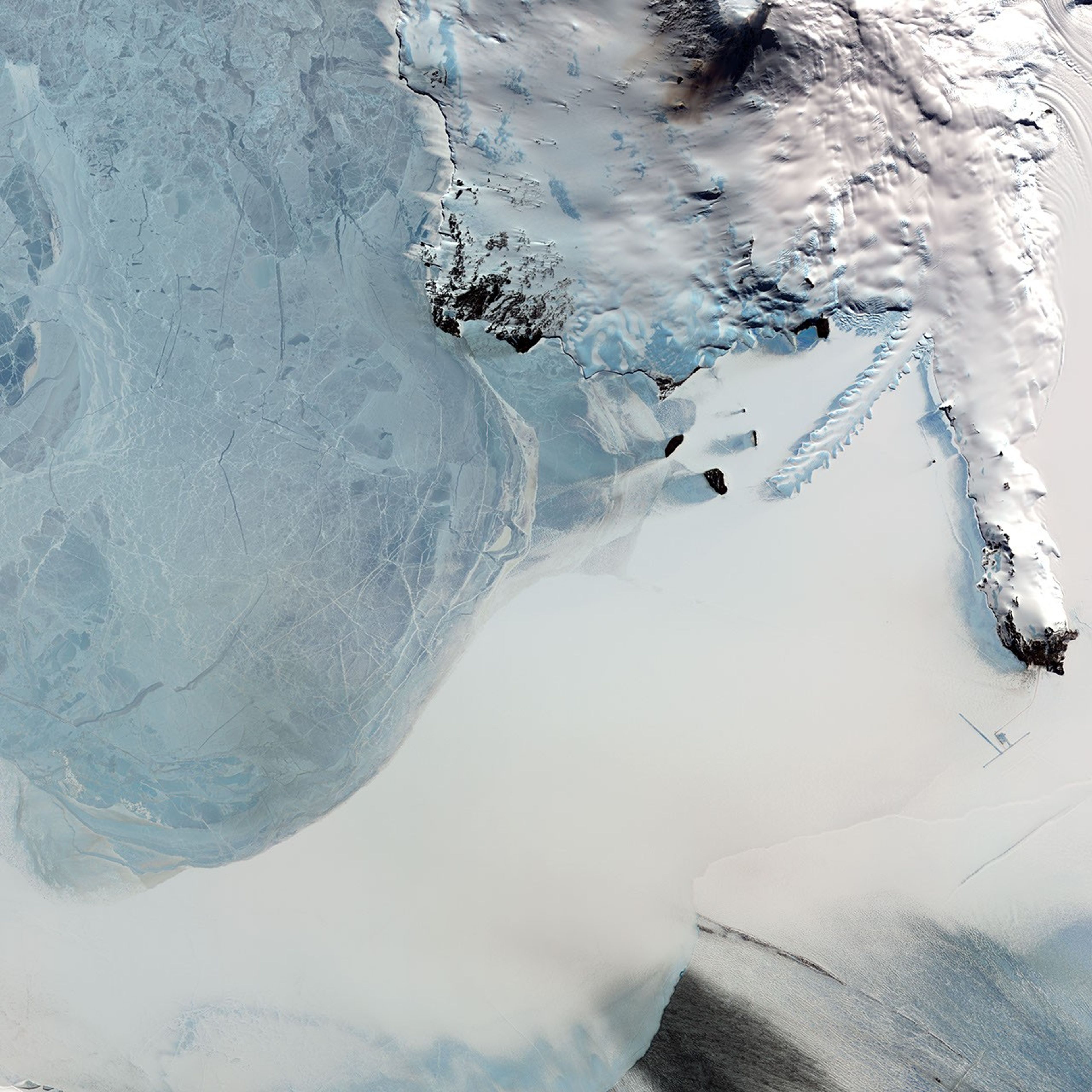 The Erebus glacier in Antarctica comes down from Mt. Erebus and protrudes off the coast of Ross Island, forming an 11-12 km long ice tongue—a long and narrow sheet of ice projecting out from the coastline. The Erebus Ice Tongue is the serrated, blue-rimmed “knife” extending toward image center from the upper right out into snow- and ice-covered McMurdo Sound. Beneath the smooth white expanse is the Southern Ocean.