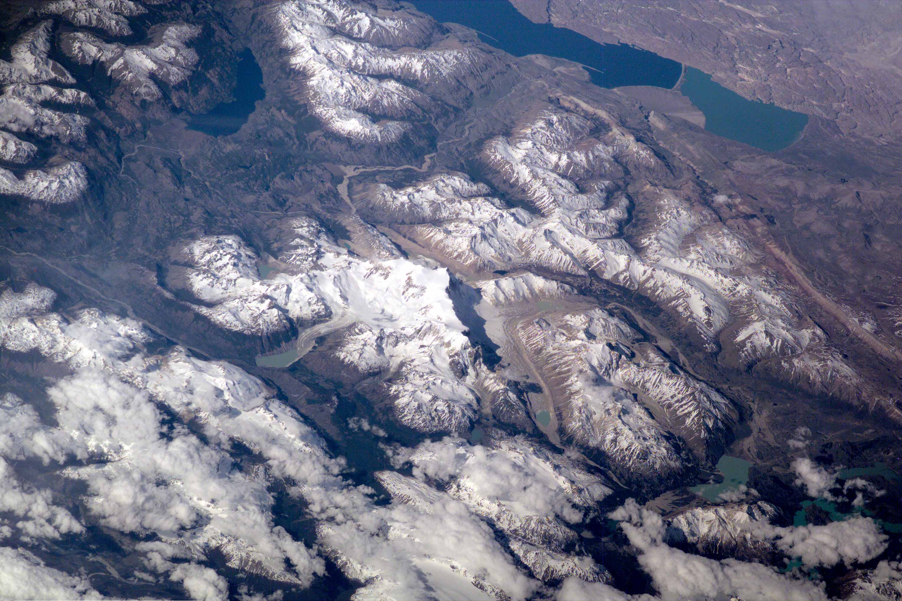 This scene on the remote, rugged Argentine/Chilean border in the far southern Andes Mountains offers numerous, dramatic examples of both erosional processes and features of ice and water. The sharp, glaciated crest of the Cerro San Lorenzo (center) exceeds 12,000 feet and casts a long shadow southeastward. Glaciers on its western flank flow into the valley. This Electronic Still Camera photo was taken from the International Space Station, in December 2000 (late spring) when most of the previous winter’s snow had melted below an altitude of 6,000 feet.