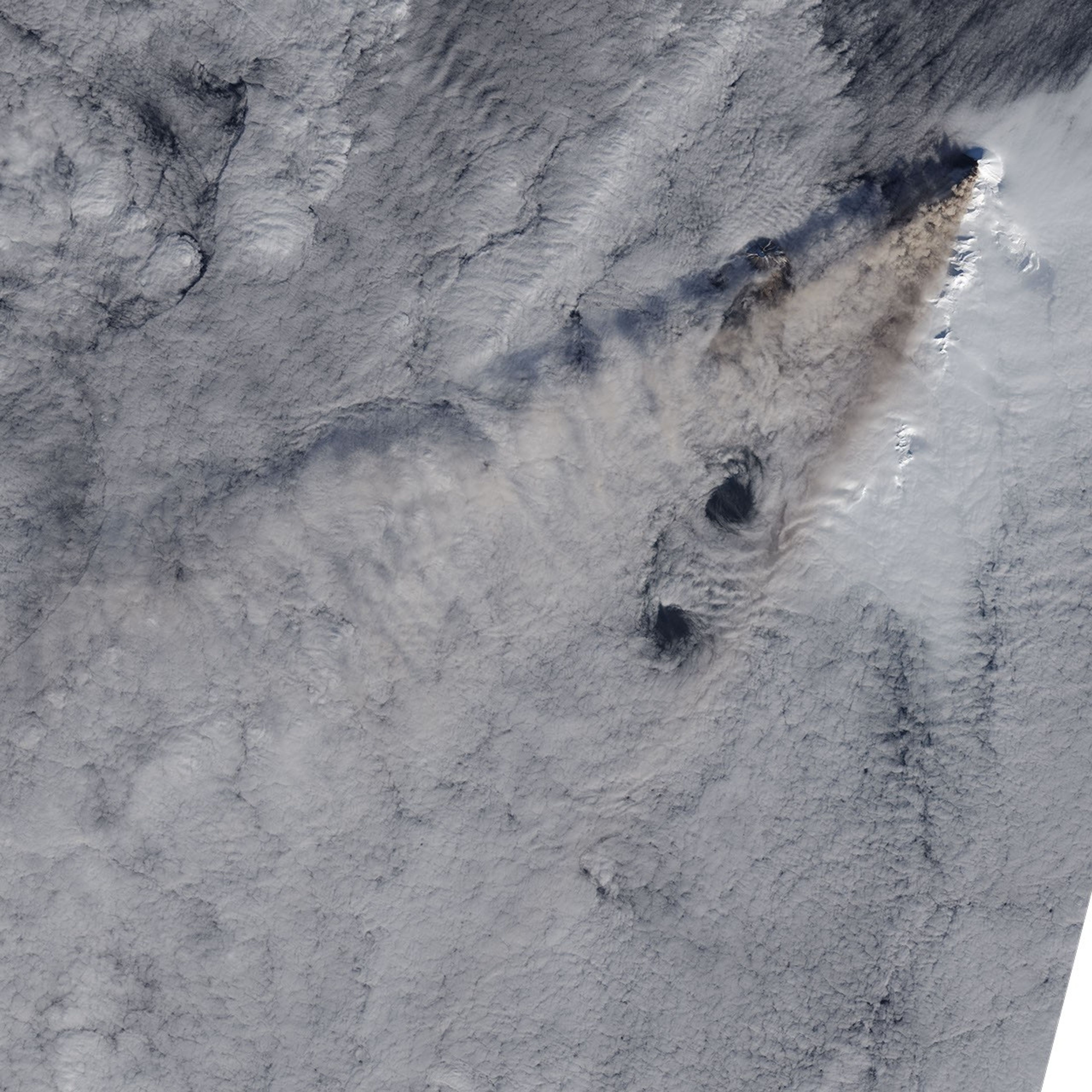 The highest plume—up to 7.5 kilometers (25,000 feet)—occurred on February 16, based on reports from the Kamchatka Volcanic Eruption Response Team (KVERT). Winds carried the ash as much as 275 kilometers to the west. Emissions continued on February 17 and 18, though plumes rose no higher than 3.6 to 4.5 kilometers (12,000 to 15,000 feet); as a result, aviation warnings were lowered to orange (the second highest level). By the 18th, winds had shifted and the plume was blowing east.