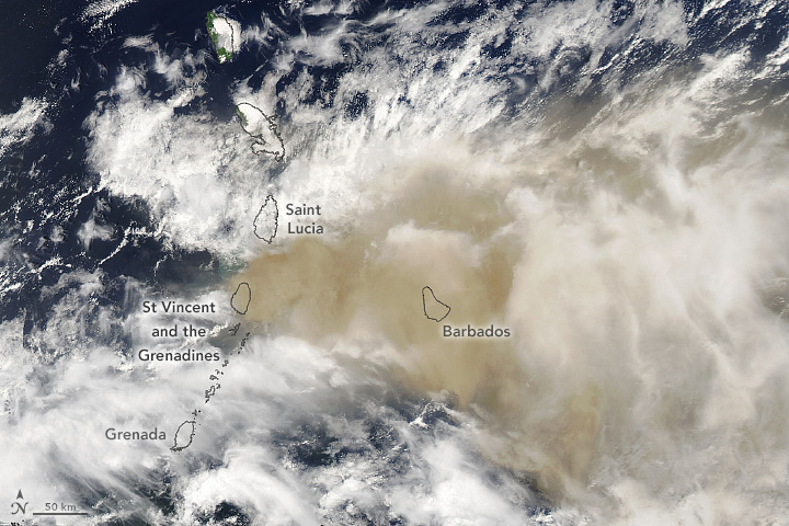 These images show ash aloft in the atmosphere, but some of it fell back to the ground. According to news reports, ashfall has blanketed parts of Saint Vincent and Barbados. It also has threatened food and water supplies on Saint Vincent and has reduced visibility, which can complicate evacuation efforts. People displaced to the island’s southern side—away from the volcano and generally safer—still had to contend with falling ash and poor air quality.