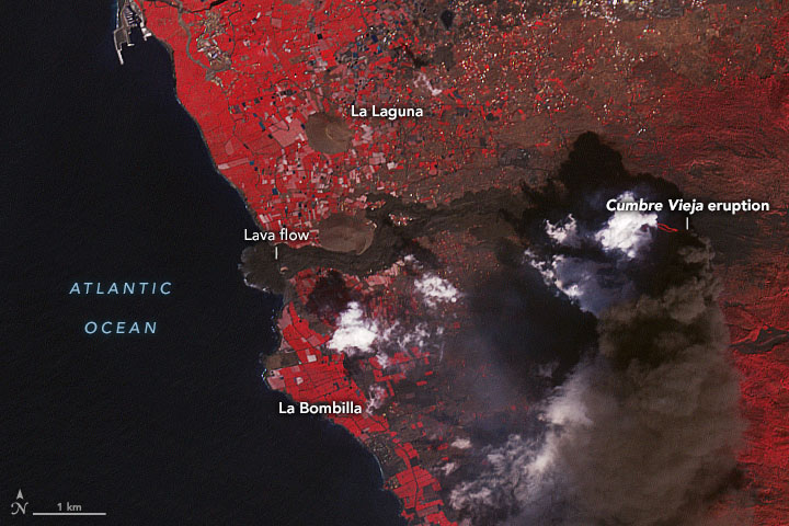 At 1:40 p.m. Western European Time on October 4, an astronaut aboard the International Space Station shot a photograph (above) of the south end of La Palma. The oblique camera angle provides a three-dimensional view of how the volcanic plume rises above and over low-level clouds. In the late morning on the same day, the Advanced Spaceborne Thermal Emission and Reflection Radiometer (ASTER) on NASA’s Terra satellite acquired a false-color image (below) of the eruption with a combination of infrared, red, and green wavelengths. In the image, vegetation is red and lava flows are brown to black. Observers on the ground also captured video of the volcano spewing ash on October 9 and of dramatic lava flows this week.