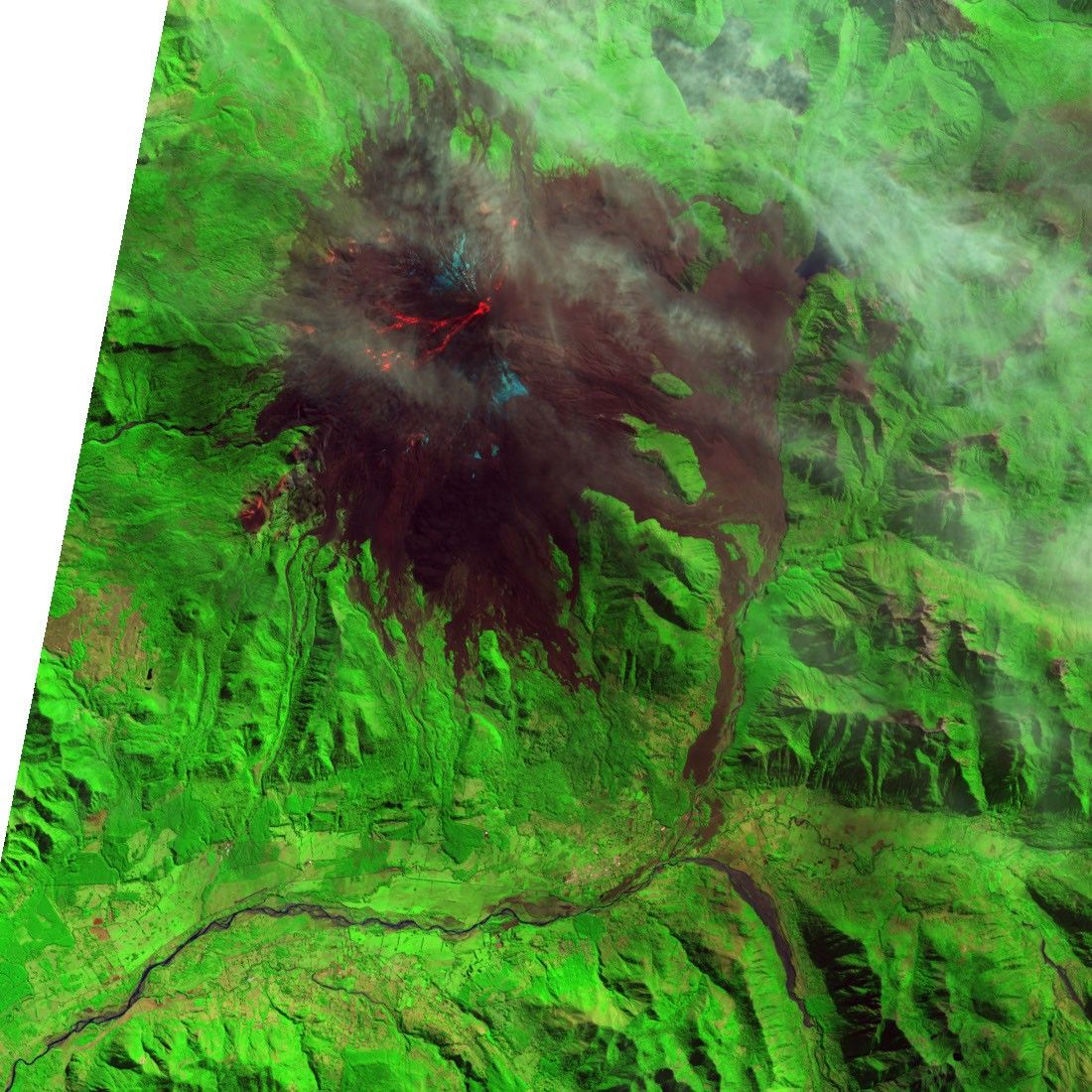 Red rivulets of cooling lava (still hot enough to emit shortwave-infrared light) reveal recent activity at this volcano, and they flow between isolated patches of blue snow cover. Lake many volcanoes, the summit of Llaima supports little vegetation, although plant life coats the volcano’s slopes. According to the Volcanism Blog, Llaima’s main crater was blocked by a pyroclastic cone—a buildup of volcanic rocks—and the volcano’s primary activity consisted of gaseous emissions as of April 8, 2009.