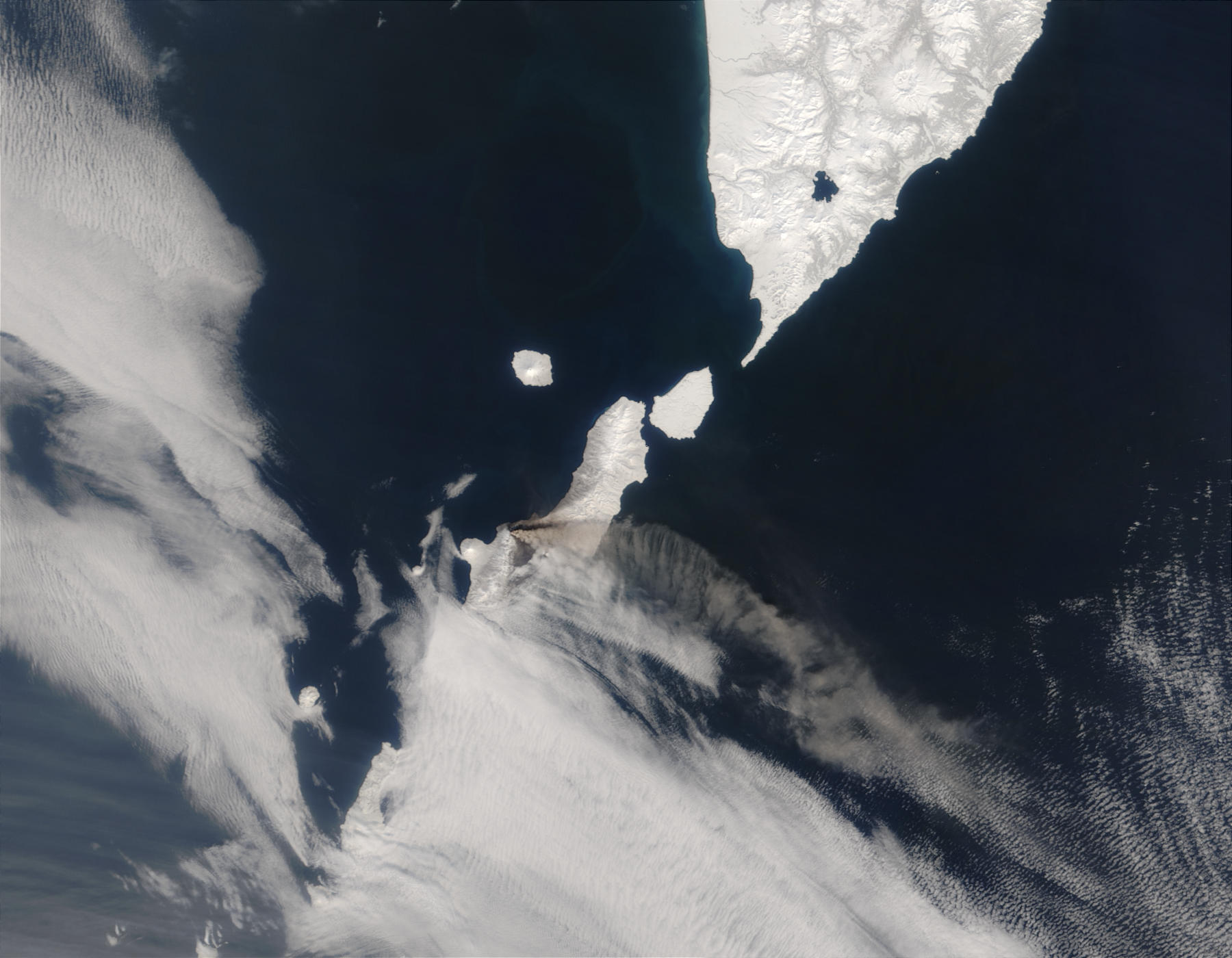 A plume of gray ash continued to stream from the Chikurachki Volcano on April 24, 2003. This image was captured by the Moderate Resolution Imaging Spectroradiometer (MODIS) on the Terra satellite.