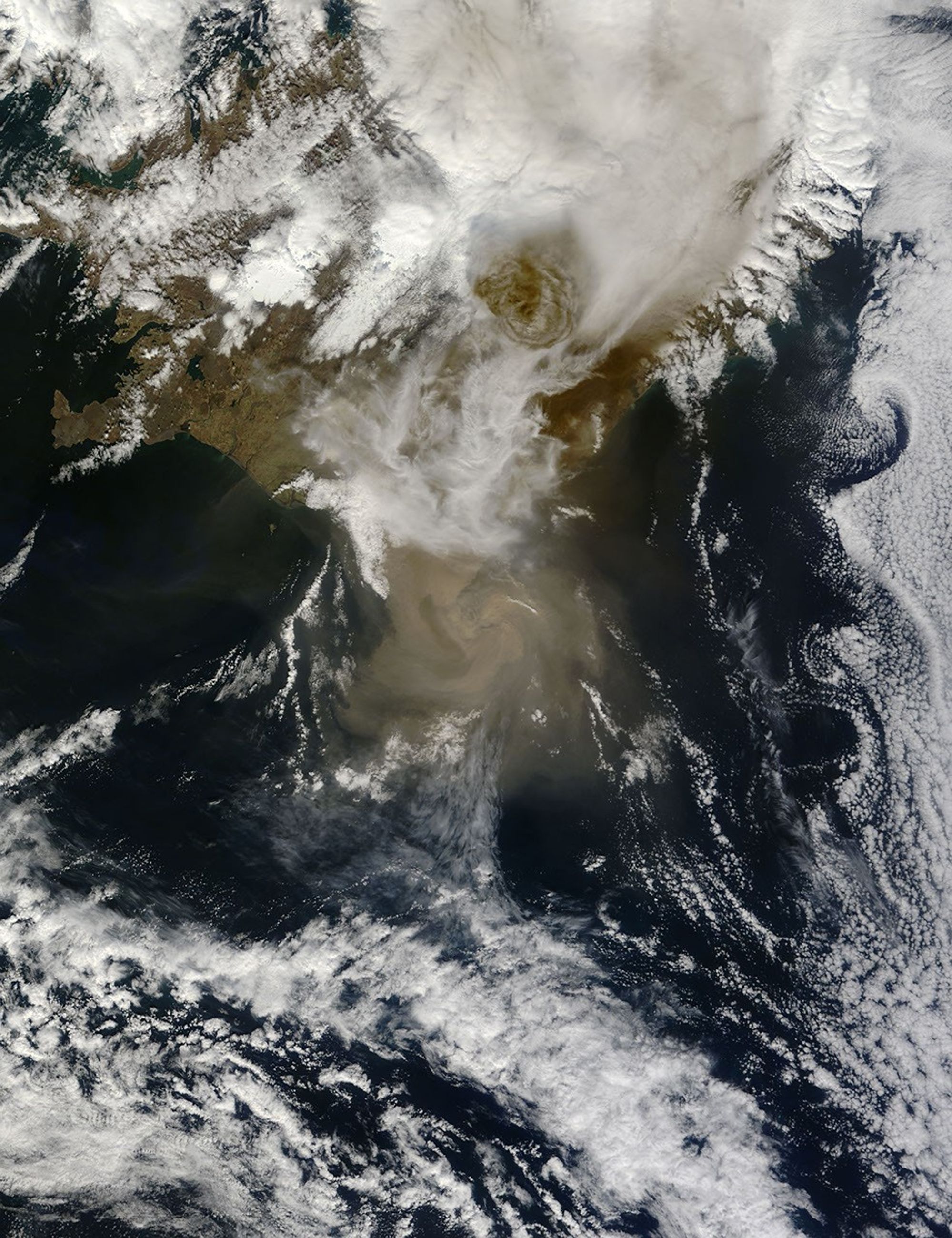 Above Grímsvötn’s summit, volcanic ash forms a circular brown plume that towers above the surrounding clouds. In the southeast, ash has colored the snow surface dark brown. Ash from the volcano reduced visibility to about 50 meters (160 feet) in some places. Iceland Review Online reported that ash falls prompted the closure of Keflavik, Iceland’s largest airport, and caused some areas turn as dark as night in the middle of the day.