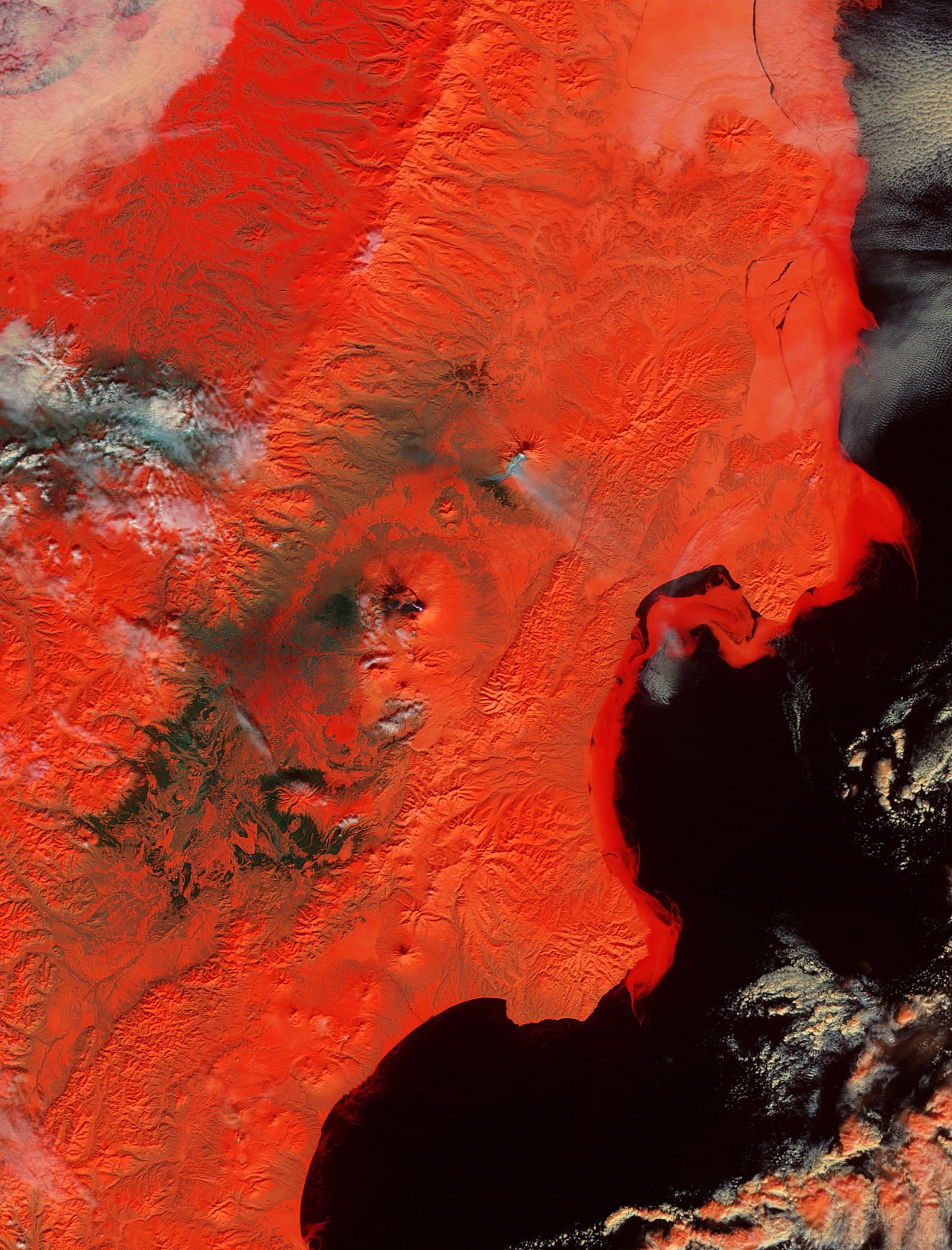 According to reports from the Volcano Live Website, Klyuchevskaya Volcano was ejecting volcanic bombs several hundred meters into the air, and lava was flowing down the western slope of the mountain. As the scorching lava comes in contact with the snow and ice on the mountain the lava has been exploding and producing ash. Since it began in late February, the lava flow has widened and is claiming more and more of the Ehrman Glacier. In this image the thermal signature from the crater is outlined in red, while what appear to be black shadows cover the northern and western flanks of the volcano. It is possible that these are mud and meltwater flows. An arm of these shadowed areas reaches northward into the valley between Klyuchevskaya and Shiveluch.