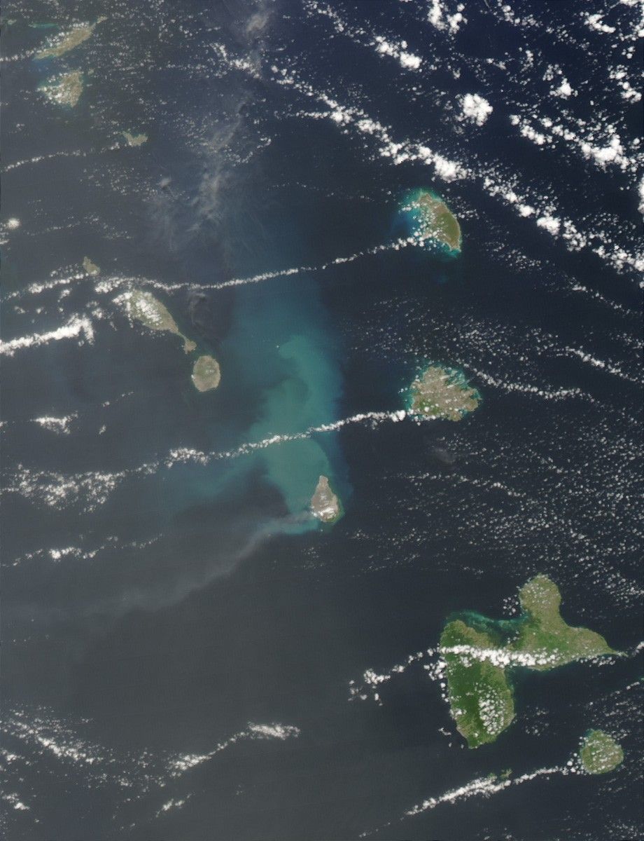 This Moderate Resolution Imaging Spectroradiometer (MODIS) image from the Aqua satellite on July 14, 2003, shows the ash plume from the erupting volcano (center) drifting westward from the southern end of Montserrat, while the waters surrounding the island are bright blue-green, probably from the ash scattered over the surface.