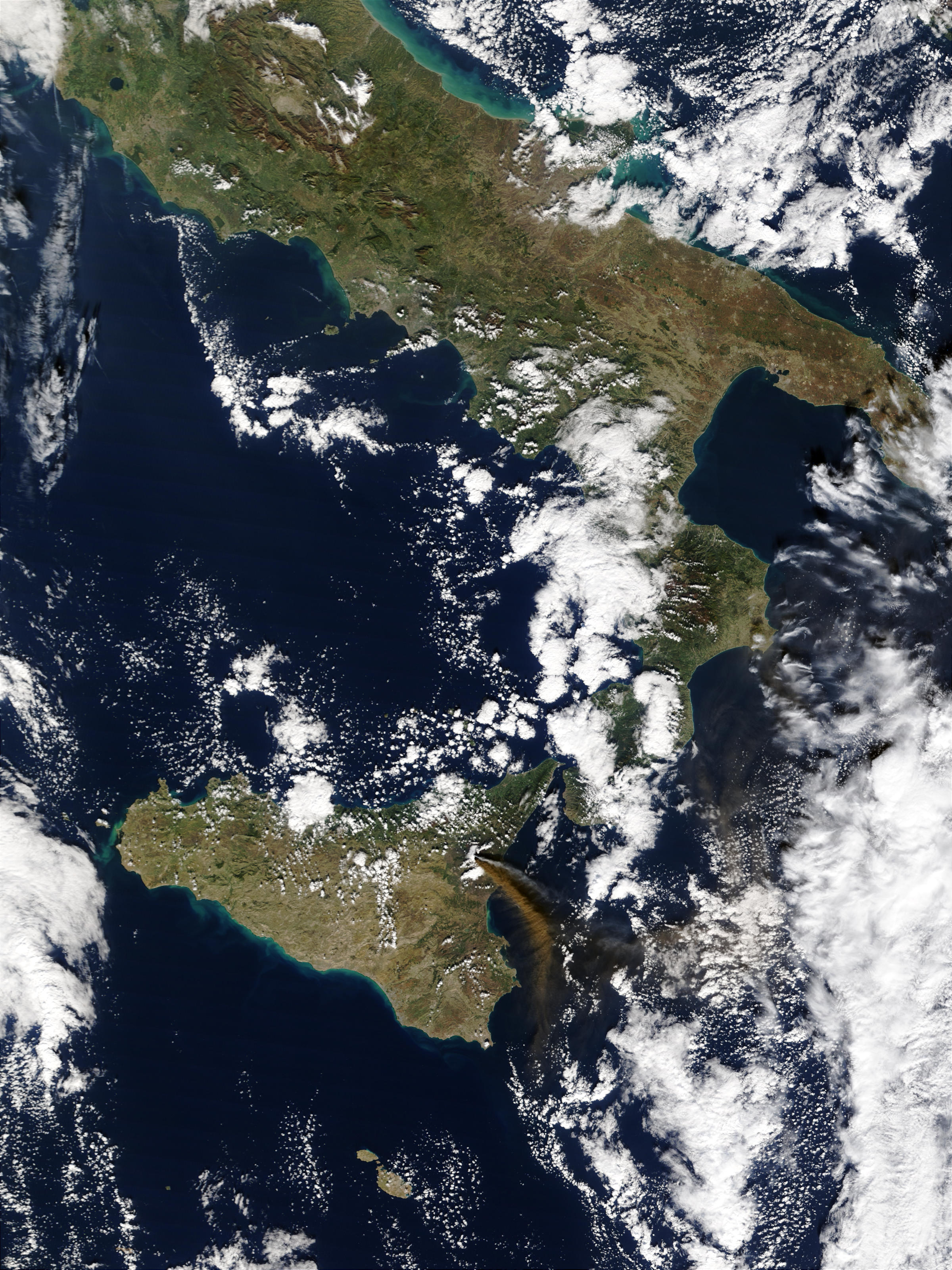 Ash from Sicily’s erupting Mt. Etna volcano continues to be visible in images from the Moderate Resolution Imaging Spectroradiometer (MODIS) on the Terra satellite. The eruption began on October 27, 2002. This image was acquired on November 7, 2002.