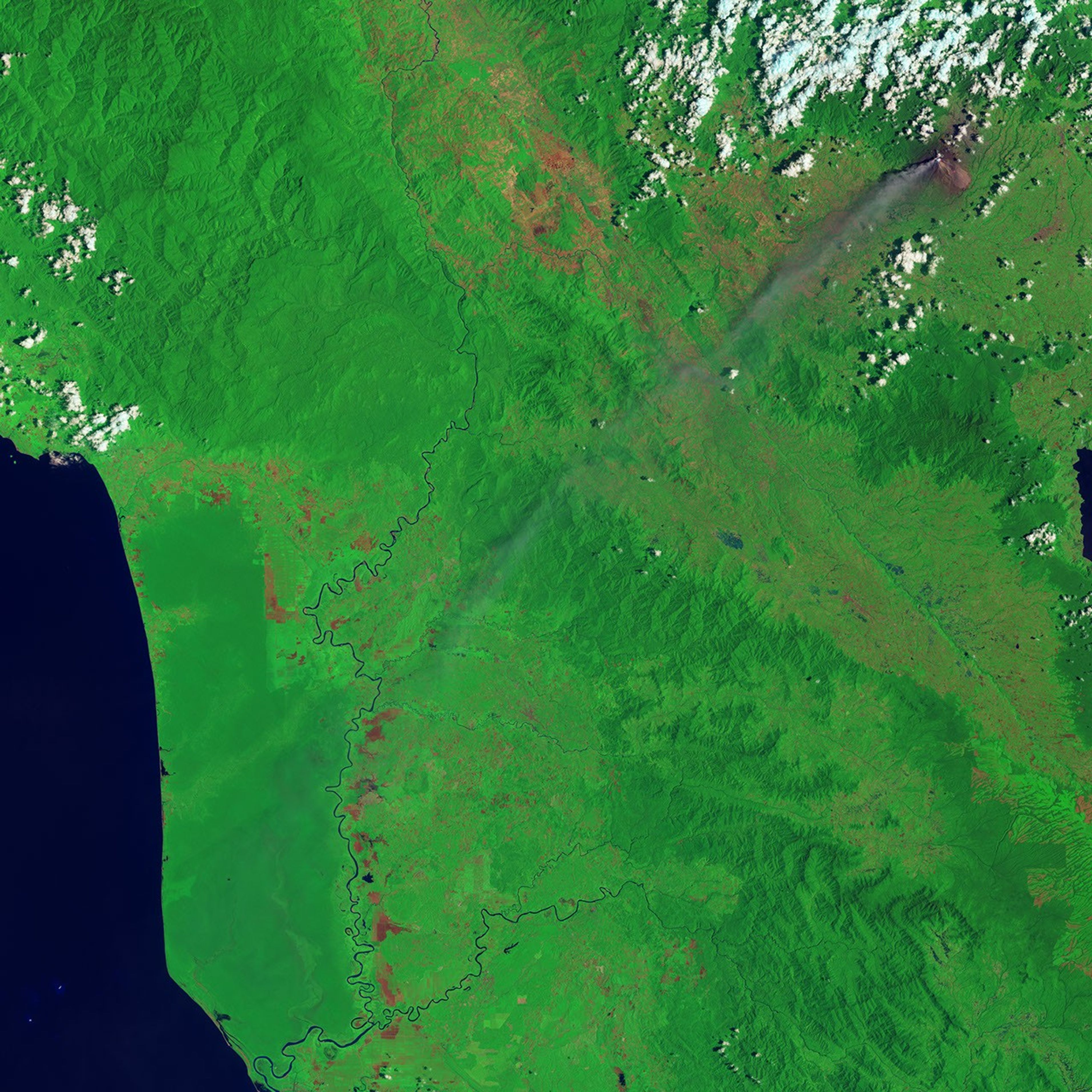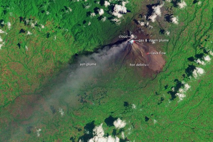 Landsat collected images of an ash plume and pyroclastic flow from Sinabung on March 6, 2014. The top, natural-color image shows the volcano, ash plume, and volcanic debris surrounded by farms and forest. The lower image, in false-color (shortwave infrared, near infrared, green), reveals a hot lava flow (red spots) creeping down the eastern flank of Sinabung. Additional hot spots may indicate an extension of the lava flow, or hot debris spilling from its advancing face. The false color image also differentiates between clouds (tinted orange) and a gas and steam plume (tinted blue) above Sinabung’s summit. Both are pure white in natural-color.