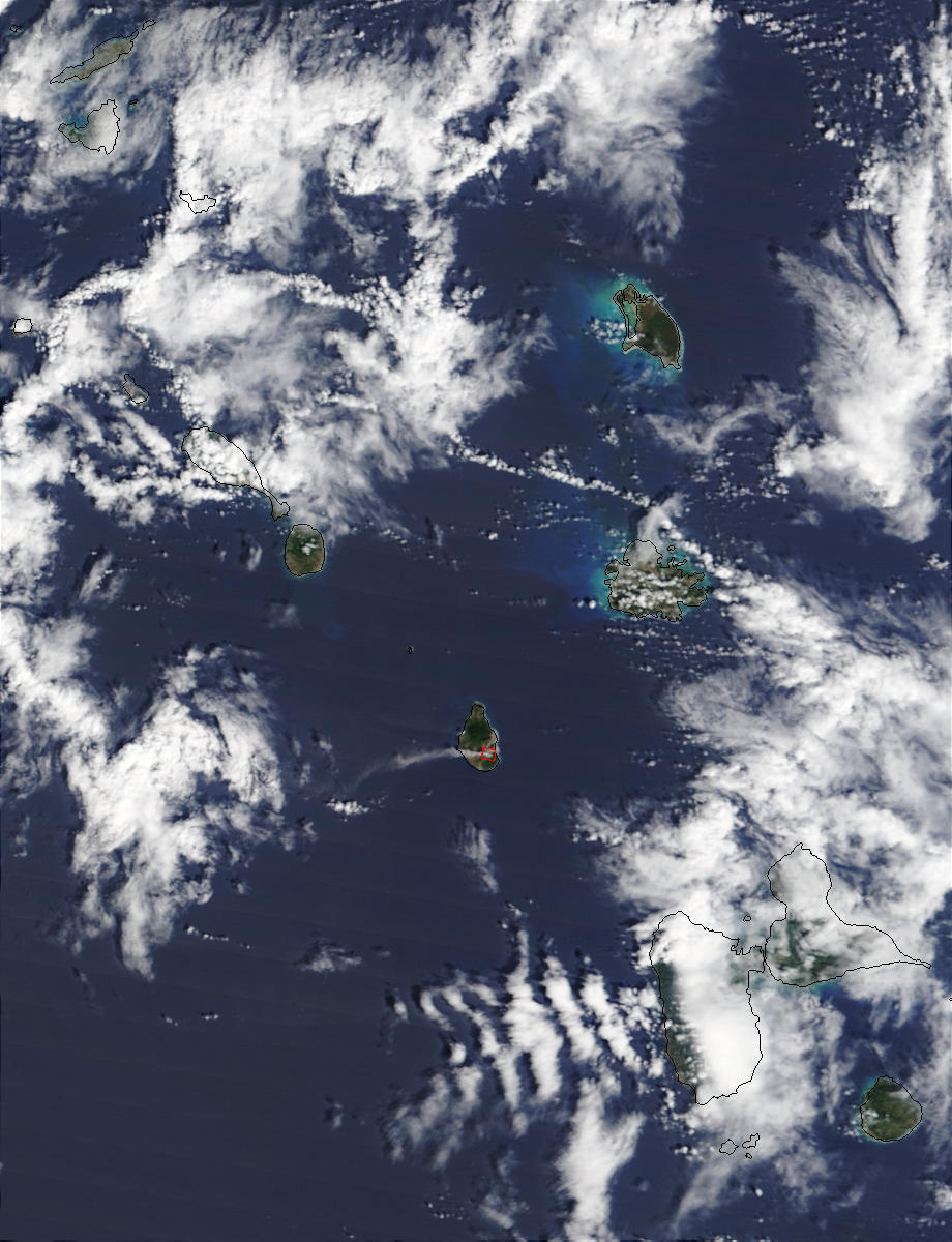 Between February 7 and 14, 2003, the Soufriere Hills Volcano on the island of Montserrat experienced moderately high volcanic activity, with hundreds of rockfalls and minor earthquakes. In this true-color Moderate Resolution Imaging Spectroradiometer (MODIS) image from the Terra satellite on Feb. 16, the thermal signature of the erupting volcano is marked with a red outline. A plume of smoke and ash drifts westward from the summit. Montserrat is part of the Lesser Antilles chain of islands that have formed where the Atlantic tectonic plate and the Caribbean tectonic plate meet.
