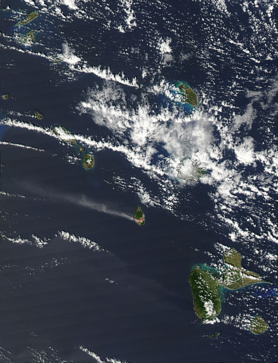 The Soufriere Hills Volcano on the island of Montserrat continues to erupt, and this true-color Moderate Resolution Imaging Spectroradiometer (MODIS) image from the Aqua satellite on February 22, 2003, shows the thermal signature marked with a red outline. A plume of emissions—probably a mixture of smoke, ash, and water vapor—is drifting eastward from the summit. Lava domes are building up on the summit, triggering pyroclastic flows.
