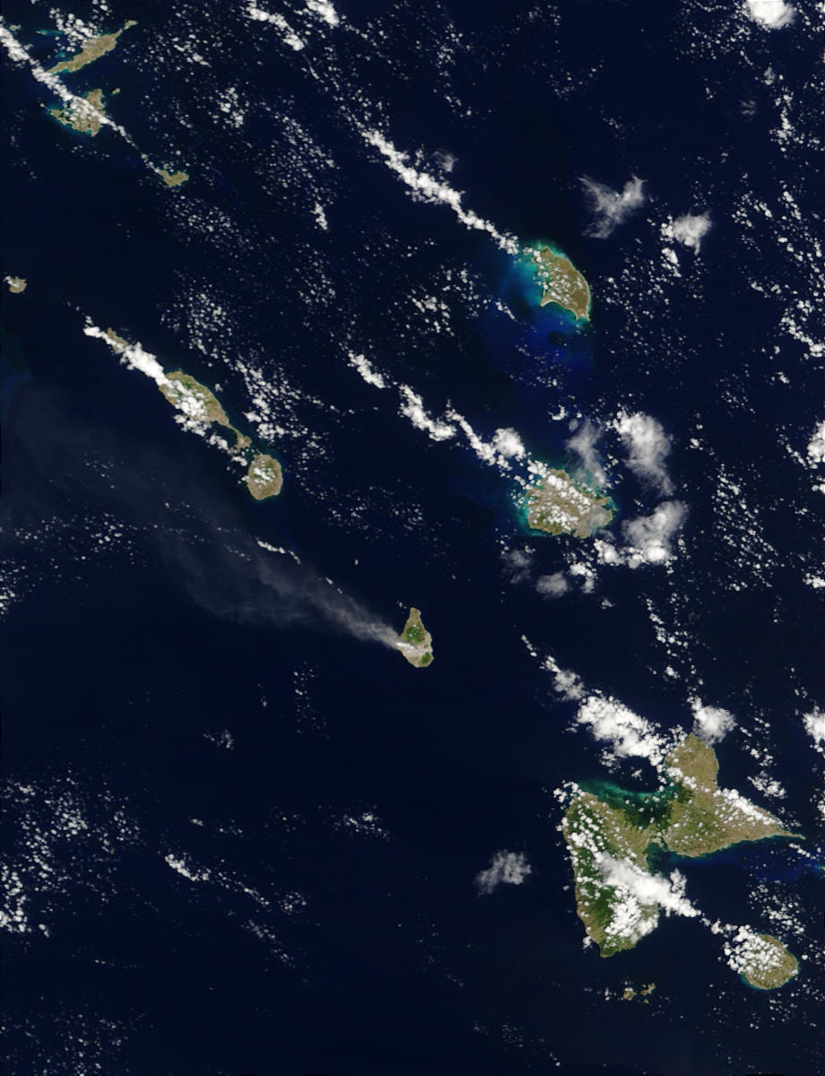 On March 24, 2003, the Moderate Resolution Imaging Spectroradiometer (MODIS) on the Terra satellite captured this image of an ash plume coming from the Soufriere Hills Volcano on the island of Montserrat (bottom) as the satellite passed over the islands of the West Indies in the Caribbean Sea.