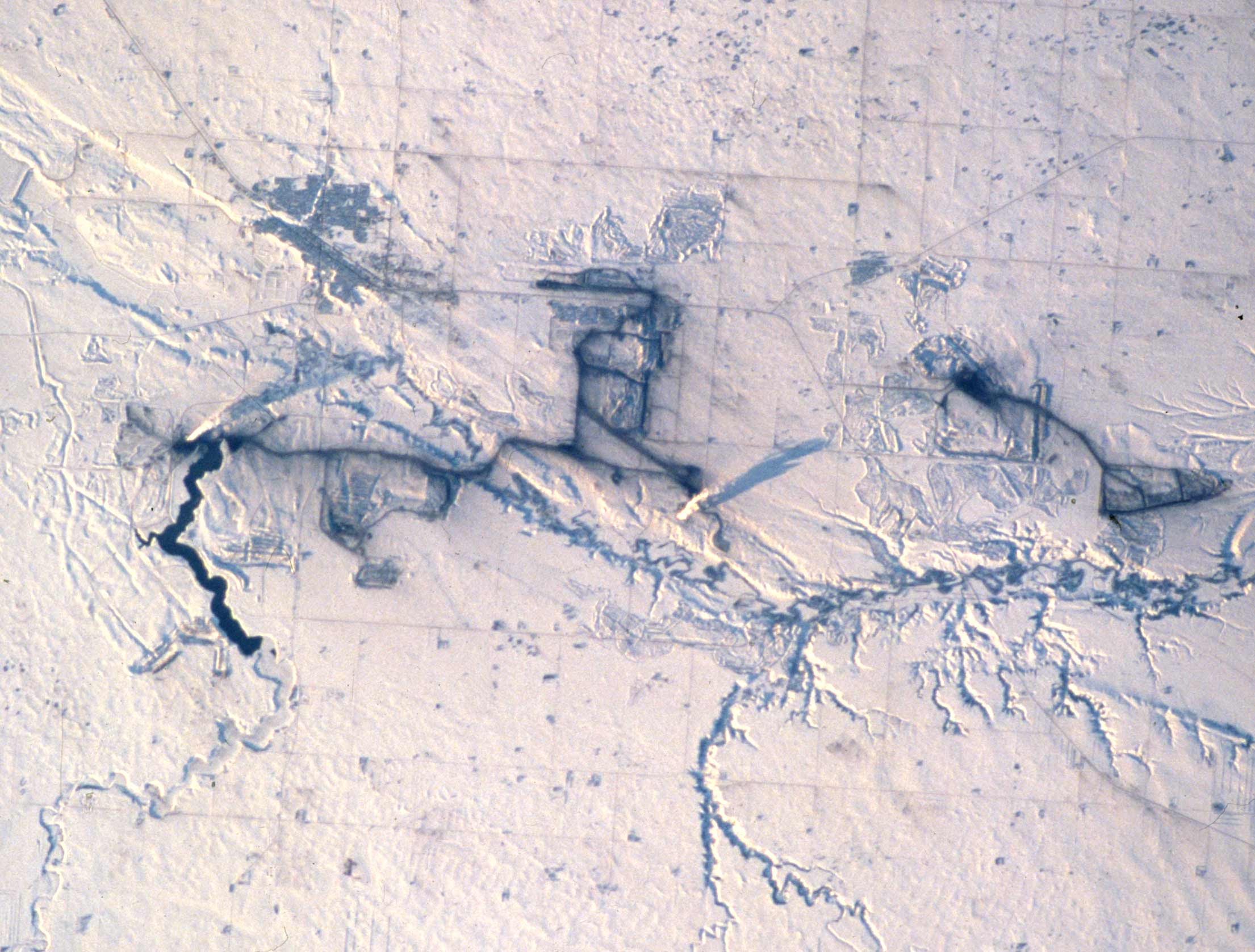 Snow and ice serve to accent human activities in this photograph taken by the Space Shuttle mission STS-98 crewmembers on February 17, 2001 (STS098-715B-84). The Souris River stretches across the photograph from left to right, with the upstream Rafferty Dam Reservoir frozen over on the far left. Two power plants, the Boundary Dam Power Station and the Shand Power Station, can be identified by the smoke plumes and shadows of those plumes. The river is frozen over upstream of the Boundary Dam Power Station, but thermal loading from the plants has warmed the water in the Boundary Dam Reservoir so that it remains nearly ice free. Downstream of the reservoirs, thermal loading is sufficient to maintain open flow in the Souris River.
