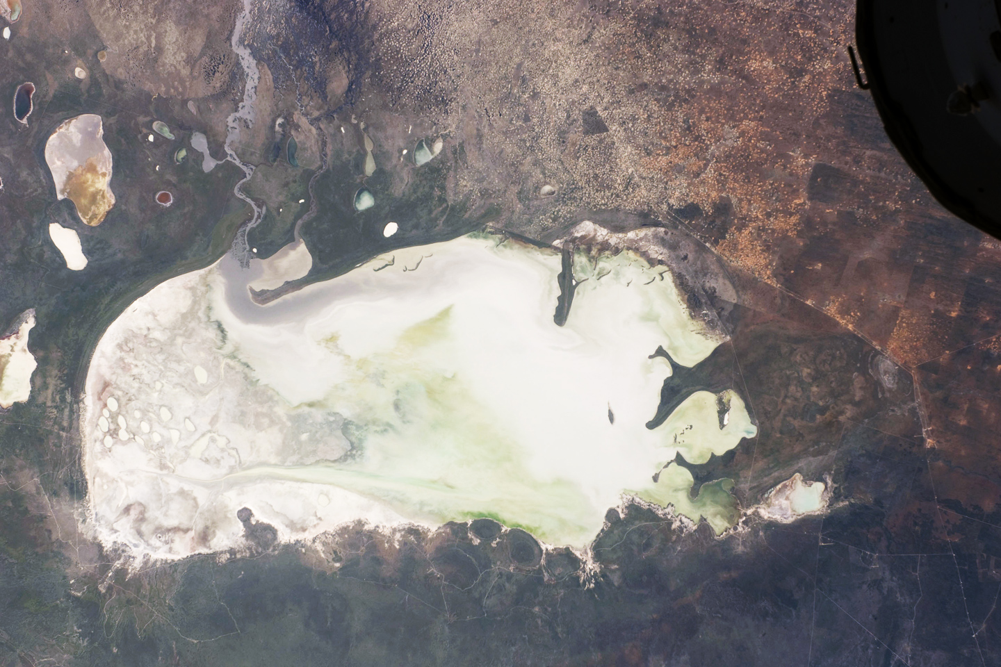This International Space Station image from March 26, 2009, shows Namibia’s Etosha Pan, which is a large, dry lake about 130 kilometers long. The lake dominates Namibia’s Etosha National Park (the sharp edge of the park fence can be seen at image right). Small, related dry lake beds appear as bright shapes at top left, and a portion of the International Space Station appears at image top right.