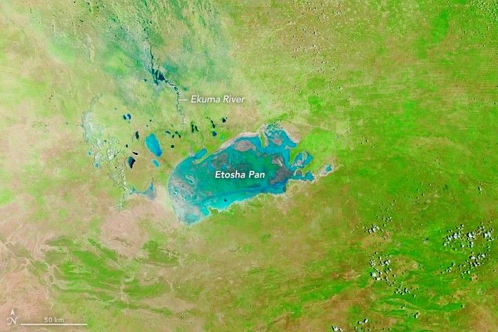 The Moderate Resolution Imaging Spectroradiometer (MODIS) on NASA’s Terra satellite acquired false-color images of Etosha Pan on December 11, 2019 and January 17, 2020. The image combines visible and near-infrared light such that vegetation appears bright green and water is teal.