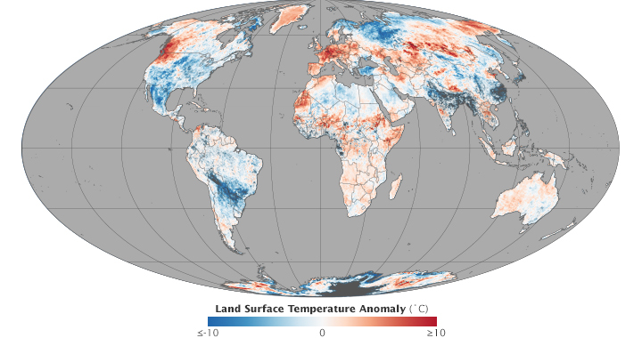 This temperature anomaly map is based on data from the Moderate Resolution Imaging Spectroradiometer (MODIS) on NASA’s Terra satellite. Observed by satellites uniformly around the world, land surface temperatures (LSTs) are not the same as air temperatures. LSTs reflect the heating of the land by sunlight, and they can sometimes be significantly hotter or cooler than air temperatures. To learn more about LSTs and air temperatures, read: Where is the Hottest Place on Earth?
