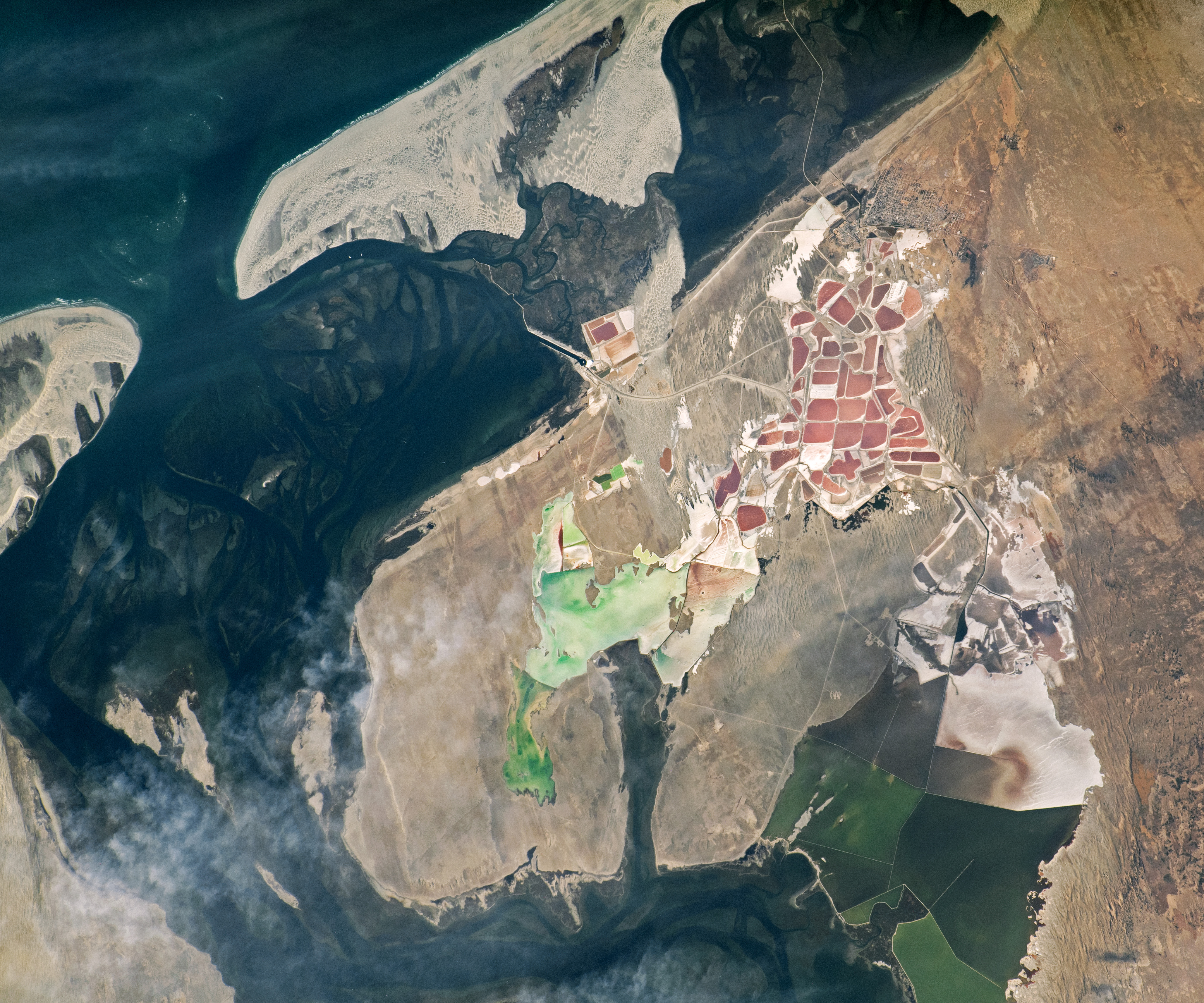 While the ponds often appear green, many of the ponds appear red here. Salt evaporation ponds can range in hue between red, green, and blue depending on the time of year, water conditions, and the mixture of microorganisms in the water.