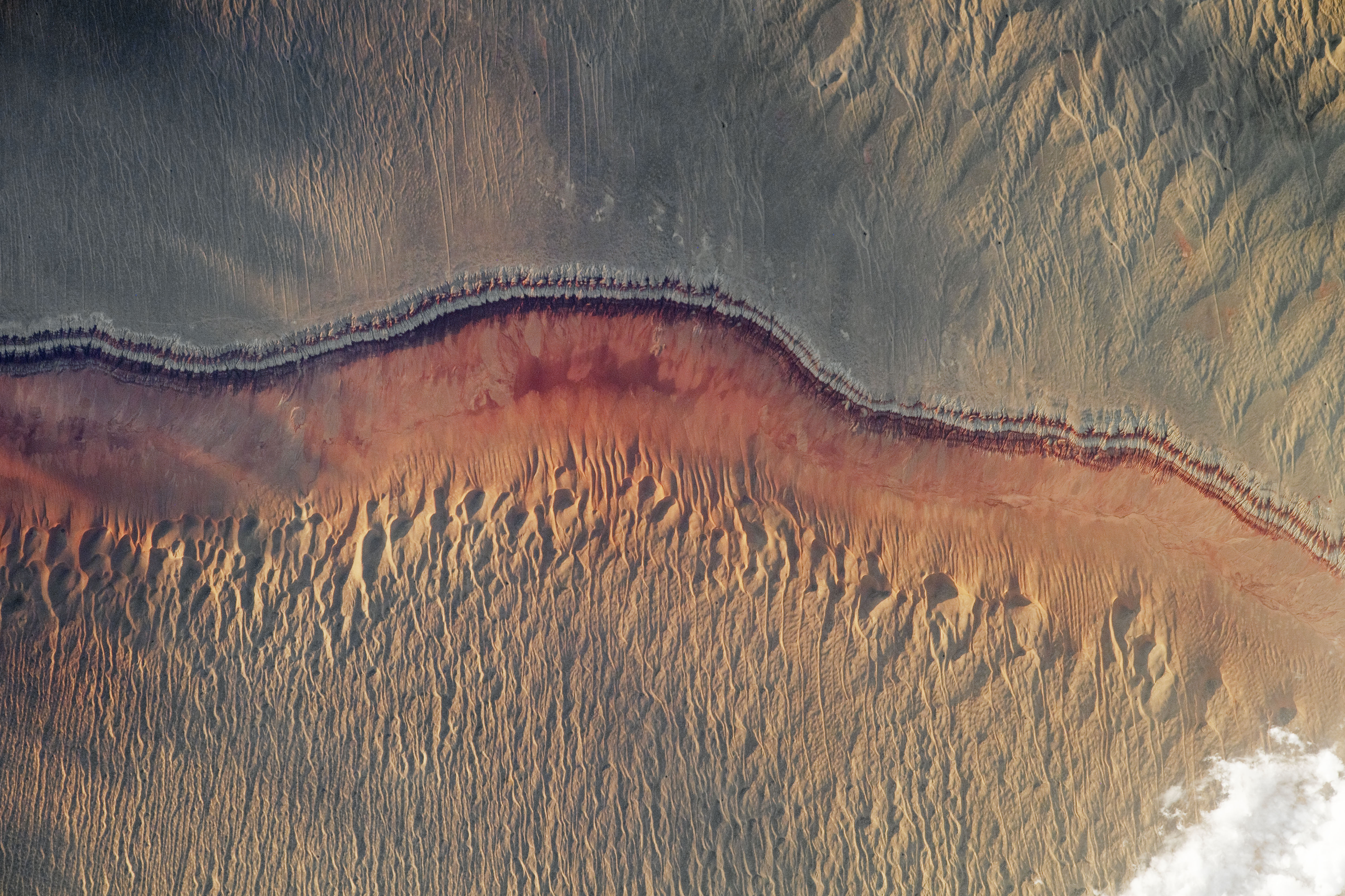 This photo, taken around 9 p.m. local time (13:00 Universal Time) on June 1, 2023, shows the western sides of sand dunes illuminated by the setting Sun. The space station serves as a unique remote sensing platform for photographing Earth due to its inclined equatorial orbit. This provides opportunities for crew to take images during day or night, depending on the timing of the station’s orbit path over a given ground location. Astronauts can use varied lighting conditions to highlight features that may be more visible depending on the time of day—especially smaller features such as dunes. Clouds (out of view of this picture to the northwest) cast long shadows that further darken parts of the image.