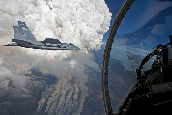The bottom two images, photographs taken from an F-15C, show a much closer view of a developing pyrocumulus cloud above the Oregon Gulch fire, a part of the Beaver Complex fire. They were taken from an Oregon Air National Guard F-15C by James Haseltine on July 31, 2014, at 8:20 PM Pacific Daylight Time.
