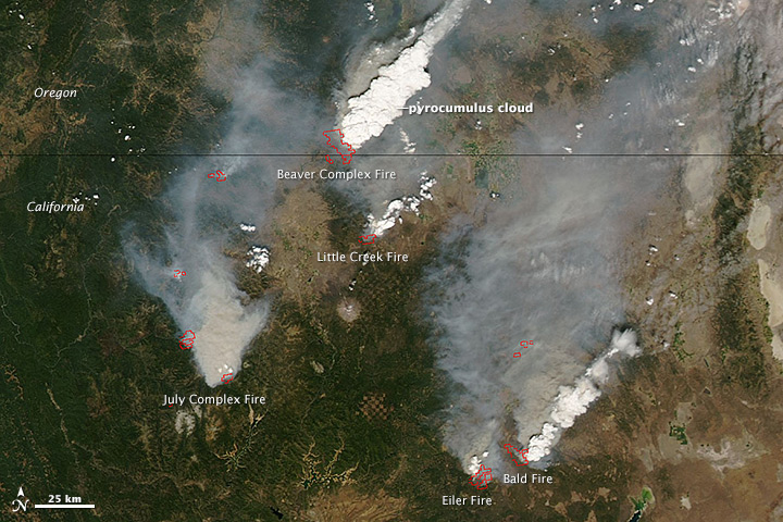 The pair of natural-color images documents the evolution and rapid expansion of the fires. Many areas of active burning expanded significantly between the satellite overpasses, as smoke plumes blossomed into towering pyrocumulus clouds. The change was most dramatic over the Beaver Complex fire along the border of California and Oregon.