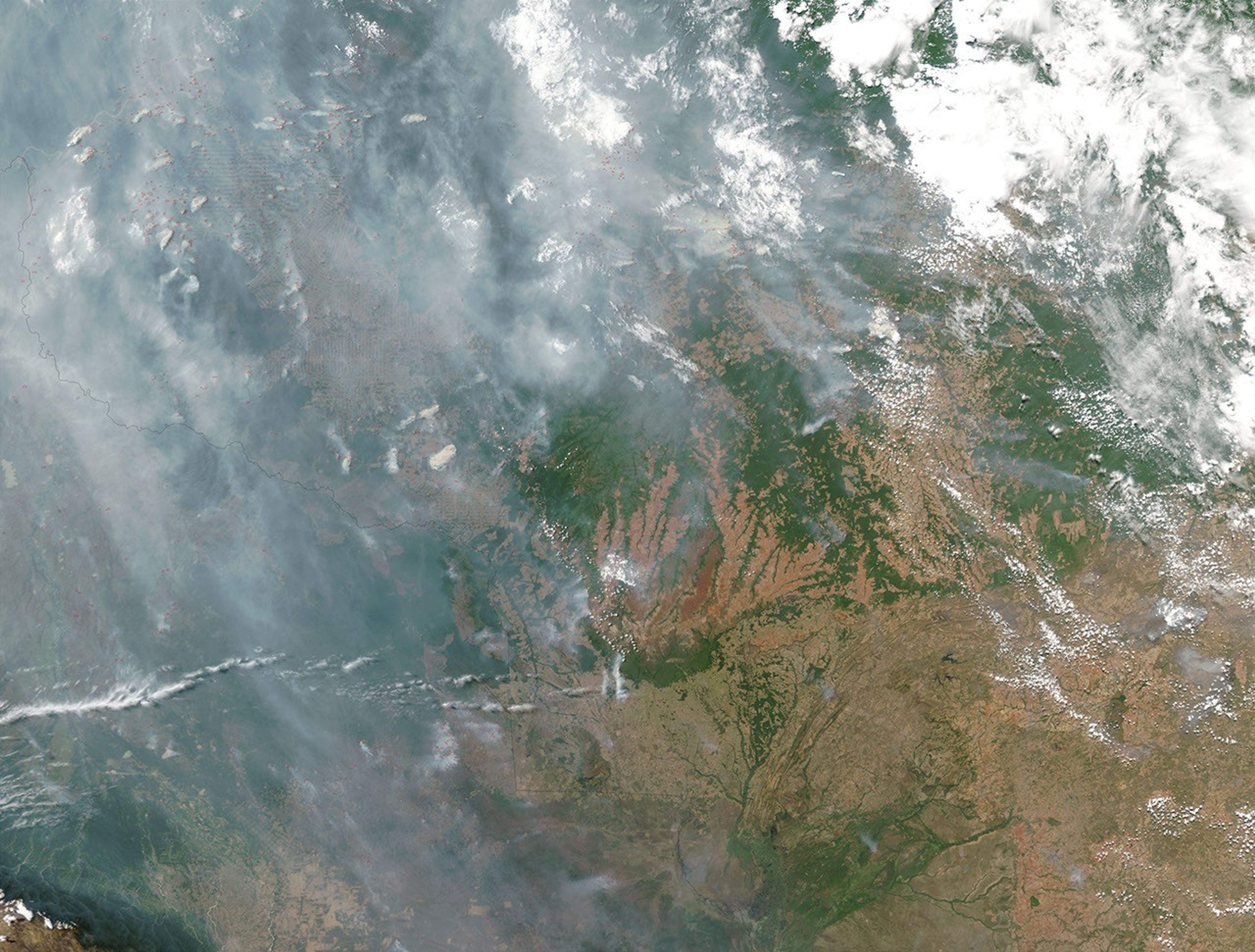 This true-color image was aquired by the Moderate Resolution Imaging Spectroradiometer (MODIS), flying aboard NASA’s Aqua satellite, on August 31, 2003. In this scene, the smoke (whitish-gray haze that fills the image) from a large number of fires (red polygons) fills the sky above Rondonia, Brazil, and almost completely blots out the sensor’s view of the surface. The familiar herringbone pattern of deforested land is unmistakable in the center and lower righthand corner of the image. The Madeira River can be seen wending its way through the upper left portion of the scene.