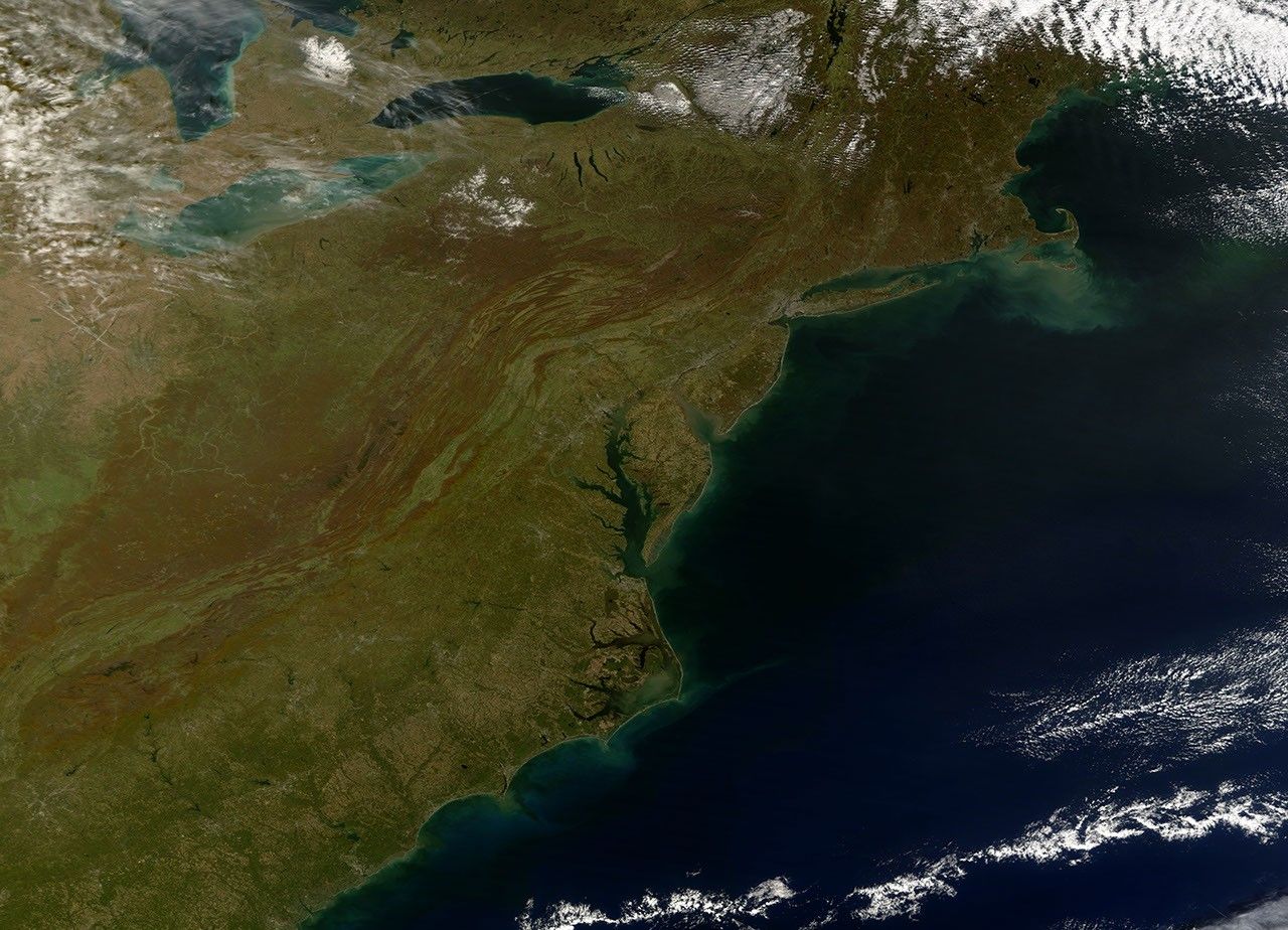 One feature common to both seasons’s images is the appearance of cities and roads. The route of Interstate 95 is easy to follow as a cement-colored line through eastern Pennsylvania, Maryland, and Virginia. Several large eastern cities dot the corridor like knots in a rope: Philadelphia, along the border of Pennsylvania and New Jersey; Baltimore, in central Maryland; Washington, D.C., sandwiched between Maryland and Virginia; and Richmond, in central Virginia.