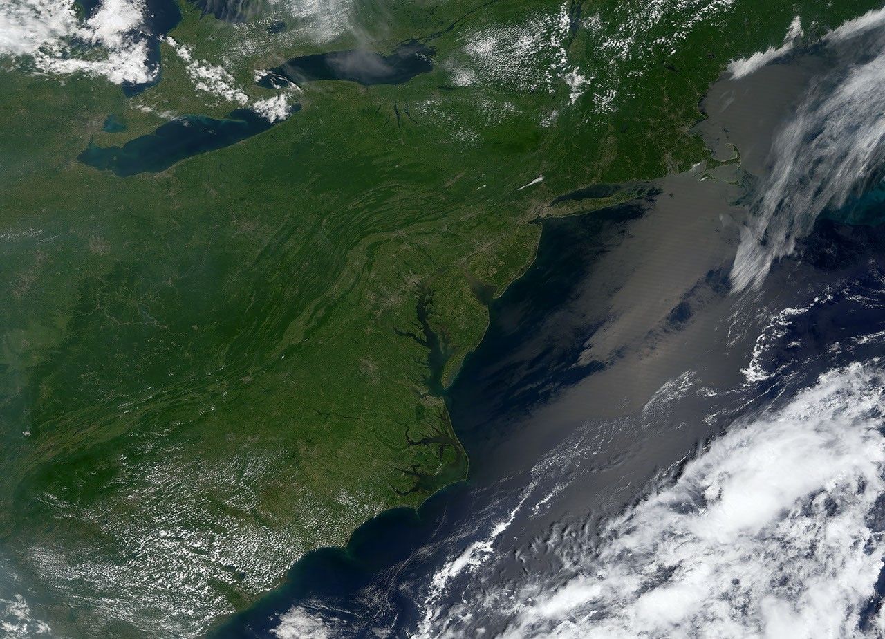 One feature common to both seasons’s images is the appearance of cities and roads. The route of Interstate 95 is easy to follow as a cement-colored line through eastern Pennsylvania, Maryland, and Virginia. Several large eastern cities dot the corridor like knots in a rope: Philadelphia, along the border of Pennsylvania and New Jersey; Baltimore, in central Maryland; Washington, D.C., sandwiched between Maryland and Virginia; and Richmond, in central Virginia.