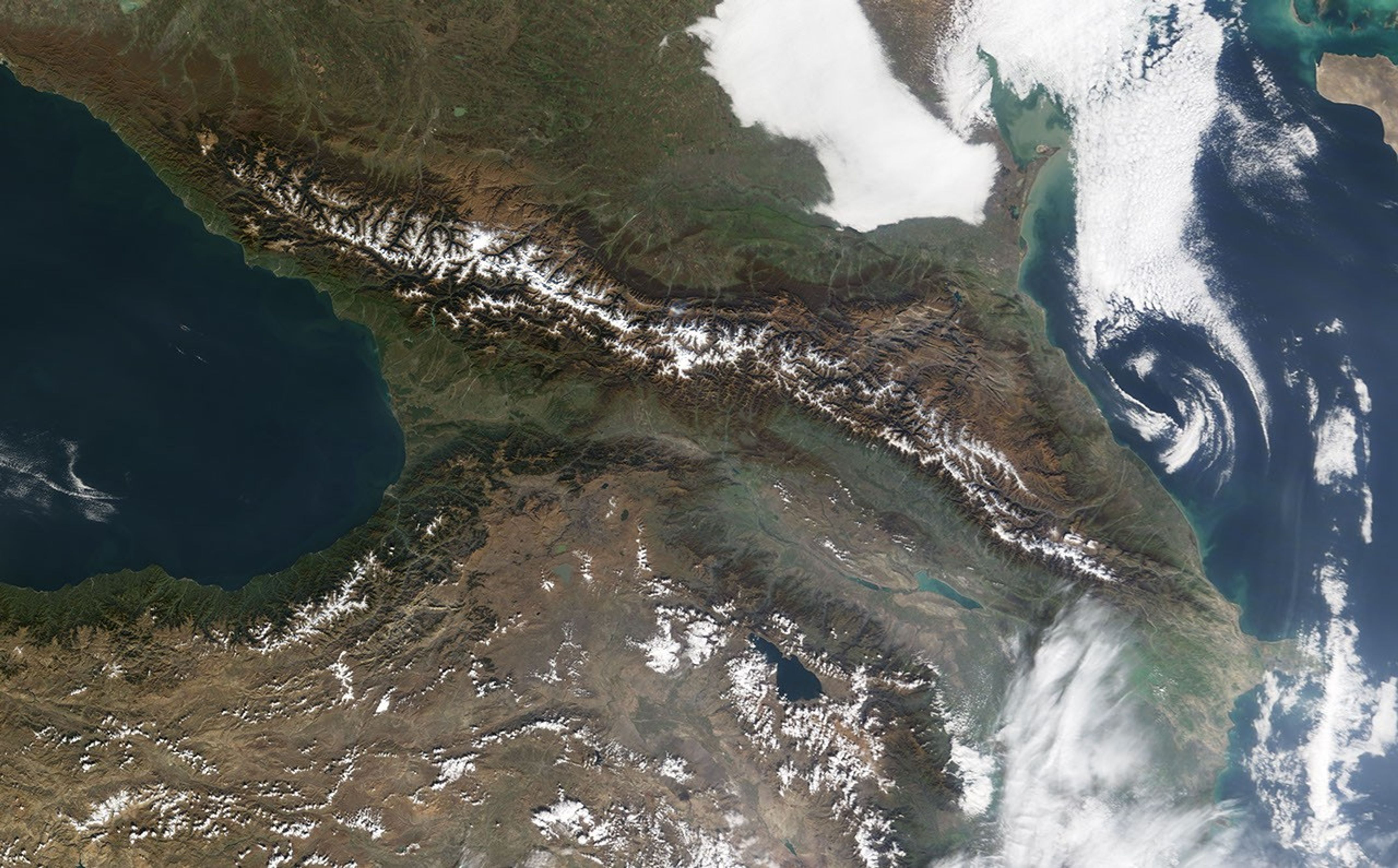 The Caucasus Mountains form a border between Russia to the north, Georgia to the south, and Azerbaijan to the southeast. The Lesser Caucasus extend southeastward from Georgia into Armenia. This image of the area was captured by the Moderate Resolution Imaging Spectroradiometer (MODIS) on NASA’s Terra satellite.