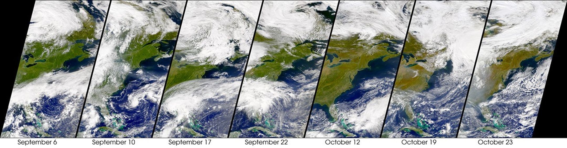 As the clouds allowed during the past two months,the Sea-viewing Wide field-of-View Sensor (SeaWiFS) recordedthe changing colors of eastern U.S. and Canadian vegetation.This series of true-color images from the fall of 2000 shows the deciduous forestsof the region change from dark green to bright red and orange,and begin to drop their leaves.