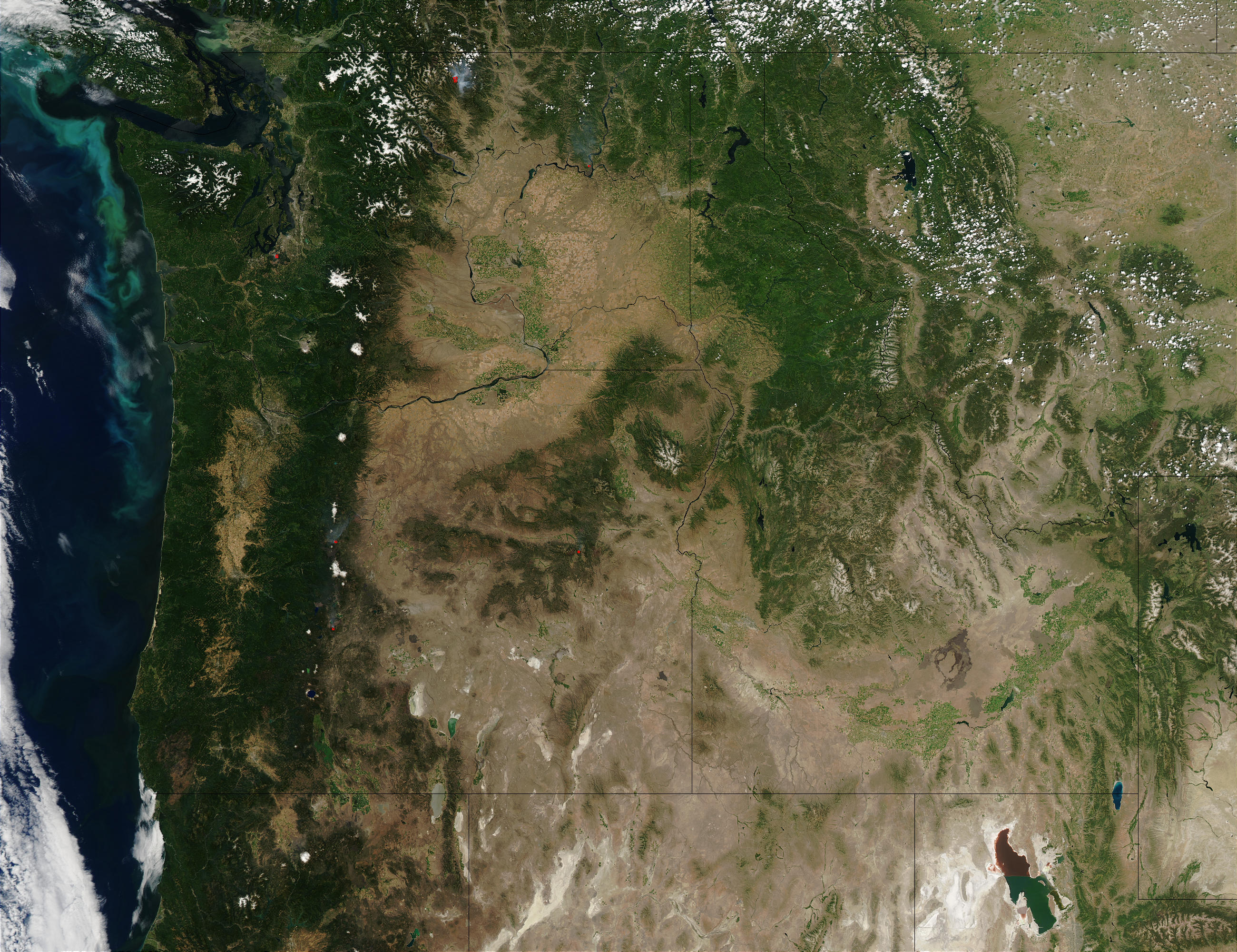 On the Colville Indian Reservation in northeastern Washington, the Rattlesnake Canyon Fire began on July 4, 2003, of undetermined causes. This Moderate Resolution Imaging Spectroradiometer (MODIS) from the Aqua satellite on July 9, 2003, shows the active fire at the far right of the image, marked with a red dot. As of July 9 reports were that the fire was more than 10,000 acres. The fire has destroyed at least one residence and numerous outbuildings, and is threatening others. The water source for the suppression efforts is 24 miles away, adding to the firefighters’ difficulties. The smoky fire to the west is the Fawn Complex Fire. Along the Pacific Coast, a bloom of phytoplankton is coloring the water bright blue and green.