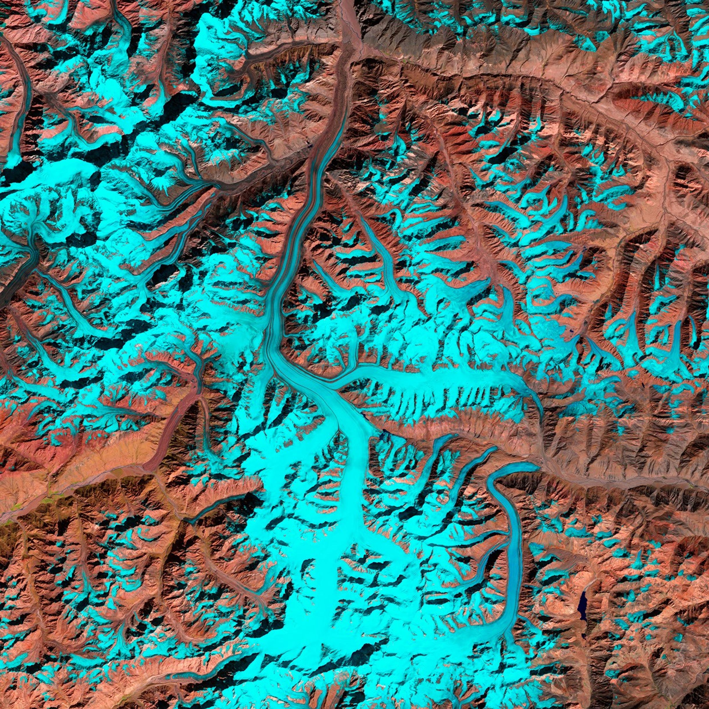 In this false-color image acquired on Oct. 2, 2011, by Landsat 5, the Fedchenko Glacier can be seen as it snakes its way northward from the western slopes of Independence Peak. The sparsely vegetated, arid mountains appear reddish-brown, while snow and ice are bright cyan. (Due to the angle of sunlight, this image may cause an optical illusion known as relief inversion.)
