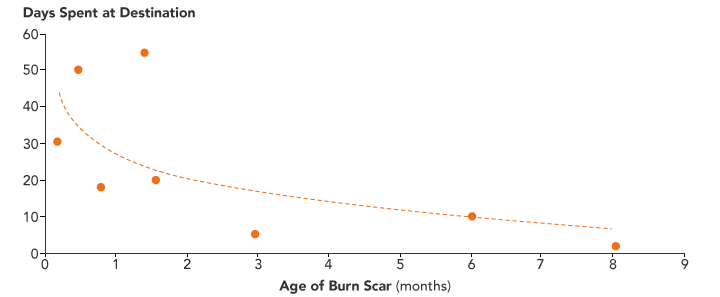 The level of impact varied, however, as not all fires are equally appealing. Cats preferred fires that were both intense and recent. The average length of stay at a burn scar was 15 days. But as the graph above shows, some some stayed longer—up to 50 days or more—if the burn was recent. Conversely, cats lingered less at older burn sites. The researchers speculate that as grasses begin to return, prey become less vulnerable.