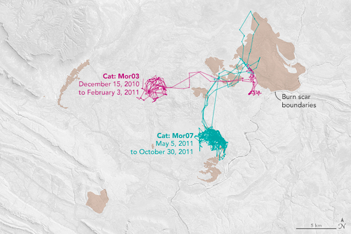 But will cats venture to burned areas beyond their territory for the chance at a good hunt? If so, how far will they go? To find out, McGregor and colleagues used GPS collars to track the movements of 32 cats in the Kimberley region of northwestern Australia between 2010 and 2013. The paths of five of those cats are represented by colored lines on the images above. The background images were acquired with the Operational Land Imager (OLI) on Landsat 8 and show the topography of the region. Brown-shaded areas depict the extent of burn scars from intense fires that occurred in 2010-2011 (top image) and 2012-2013 (second image).