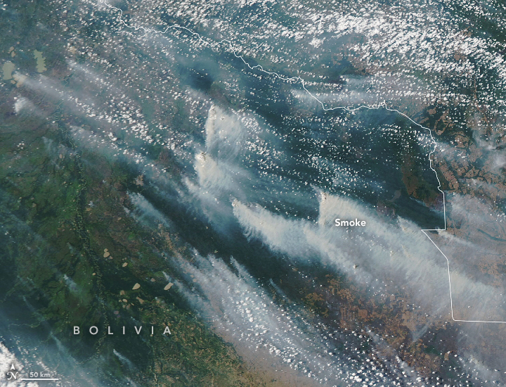The Moderate Resolution Imaging Spectroradiometer (MODIS) on NASA’s Aqua satellite acquired these natural-color images showing smoke streaming from fires in the Chiquitano forest of eastern Bolivia from October 7 to 10, 2020. The red dots are active fire detections—locations where the Visible Infrared Imaging Radiometer Suite (VIIRS) detected unusually warm temperatures associated with fires. The image below shows the smoke plumes on just October 9.