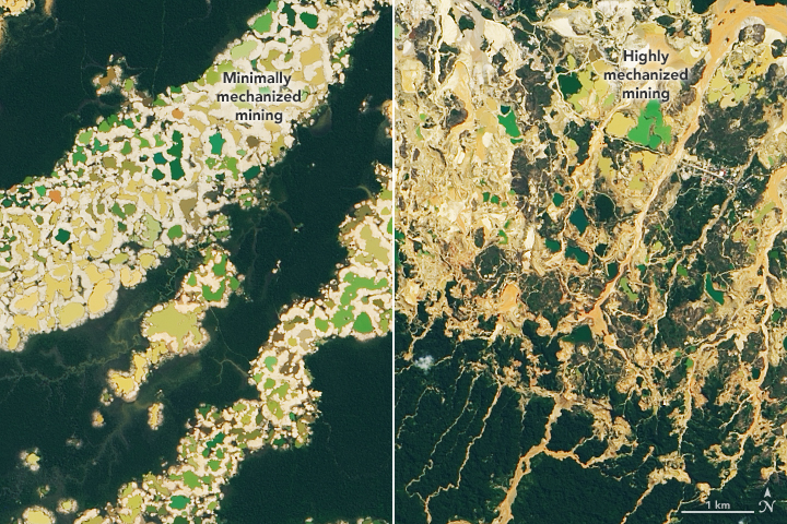 The Landsat 8 images above show examples of two different artisanal gold mining techniques. Highly mechanized excavation uses heavy machinery to dig into the ground. Minimally mechanized mining uses high-pressure water cannons and suction pumps to move sediments from the bottom of creeks and rivers.