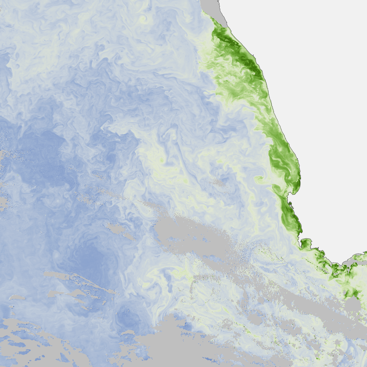 “There is some scientific value in this sort of processing in the qualitative sense,” Kuring notes. “For example, I have sent these qualitative, feature-rich images to scientists on research cruises to help them plan their cruise tracks. When sampling the open ocean, researchers often want to drop their instruments into frontal regions where the most interesting phenomena occur. Images like these make such regions more apparent by enhancing gradients.”