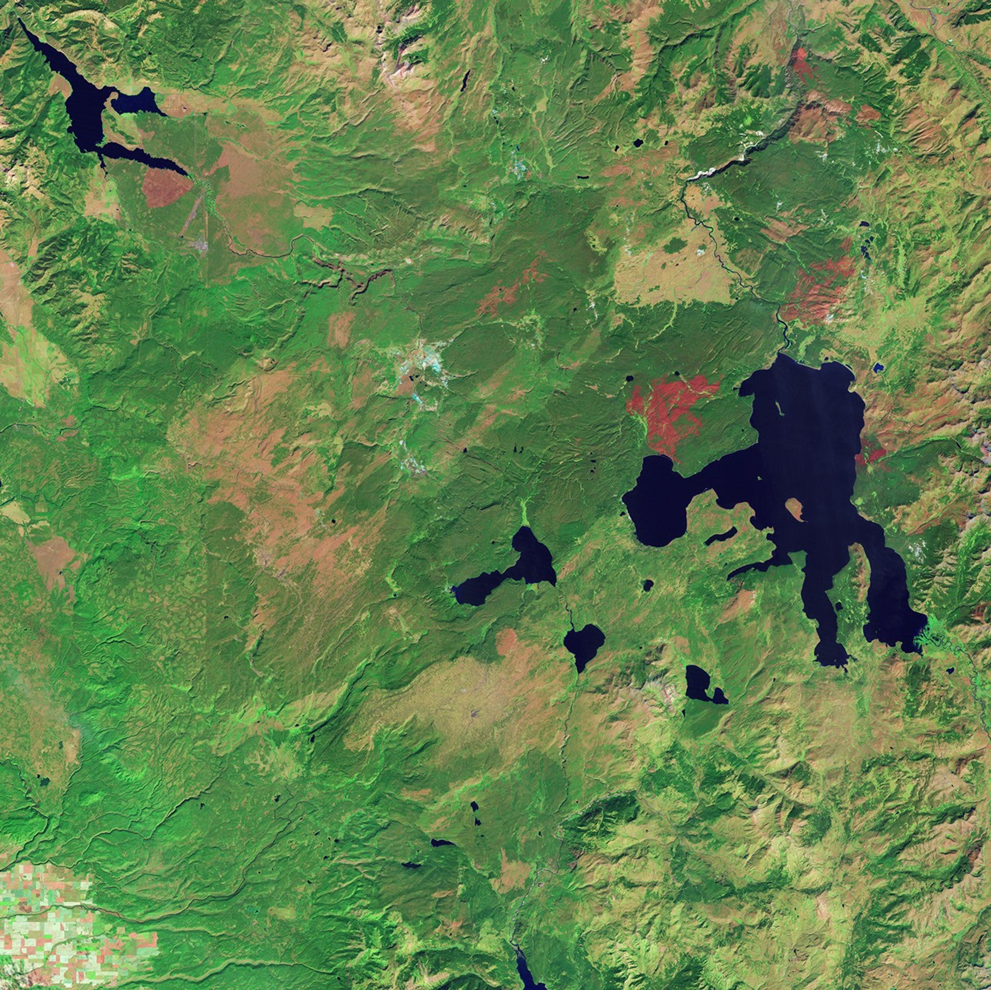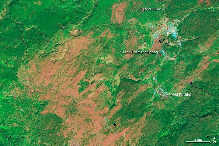 These images, taken by the Landsat satellites, contrast 1989 and 2011. Burned land is deep red in the 1989 image. By 2011, more than two decades later, the scar faded to tan-orange, but it was still present. Year-to-year images are available in the Earth Observatory’s World of Change article, Burn Recovery in Yellowstone.