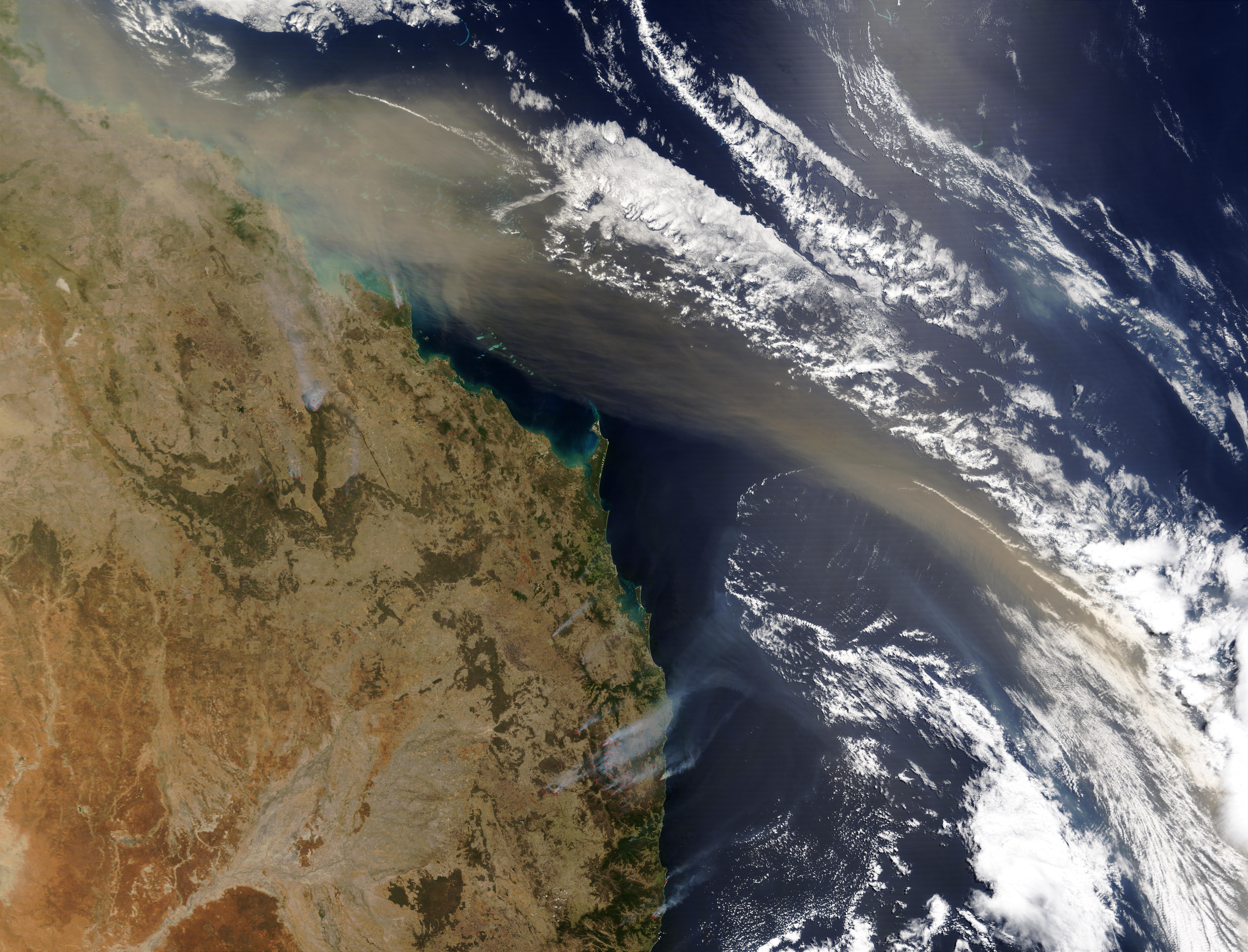 Fires continue to burn in New South Wales on October 23, 2002. This image was acquired by the Moderate Resolution Imaging Spectroradiometer on the Terra satellite, and shows active fire detections marked with red dots. At the top and right side of the image, a large dust plume reaches out over Coral and Tasman Seas. The plume is coming from a dust storm in central Australia.