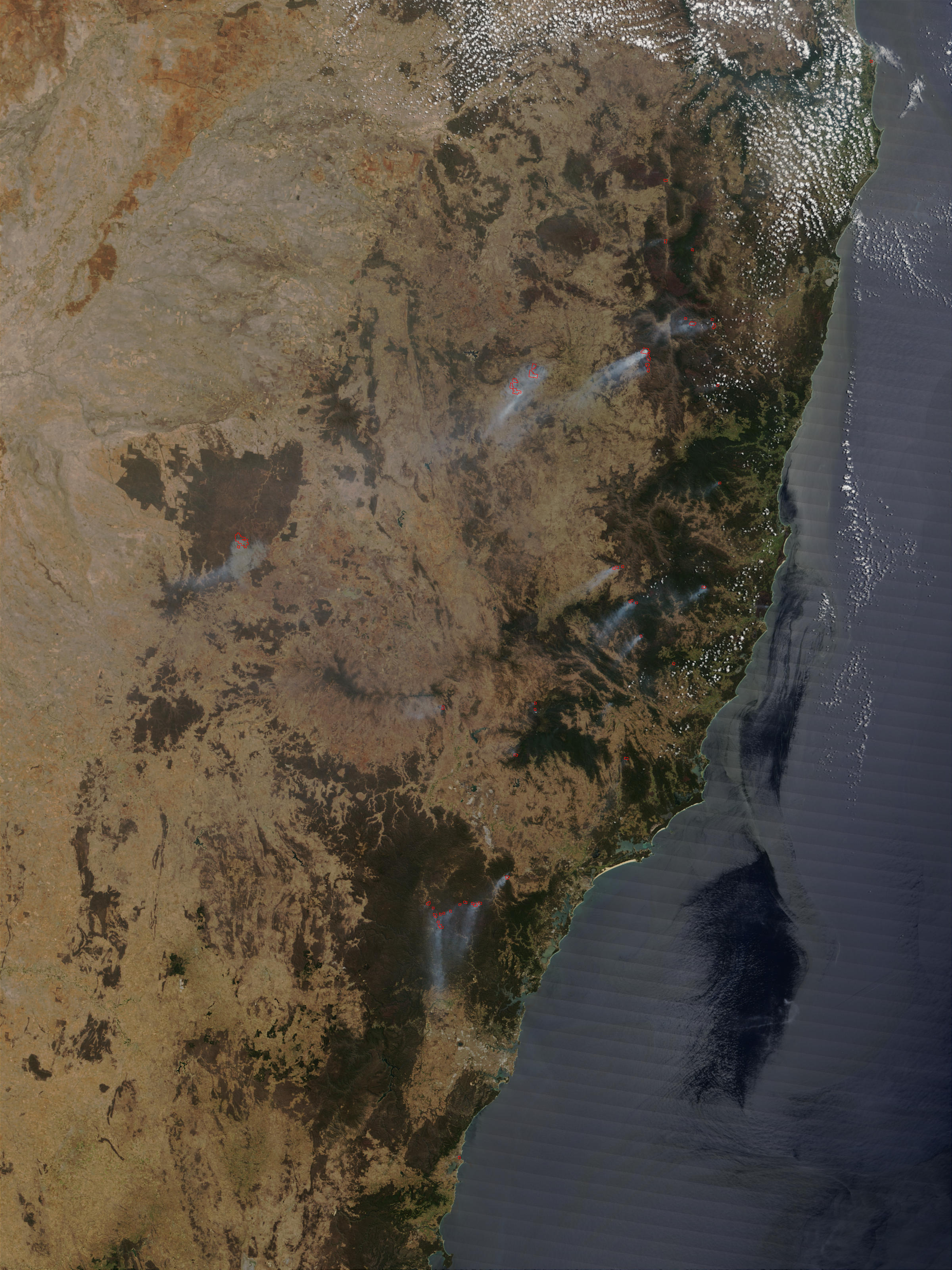This true-color Moderate Resolution Imaging Spectroradiometer (MODIS) image from the Terra satellite on November 7, 2002, shows numerous large fires (red dots) still burning throughout New South Wales, Australia. According to news reports, firefighters are battling the long-term drought as well as gusty winds and extreme heat in their efforts to control the blazes that are springing up throughout the territory. This image shows Sydney at the bottom of the image; the metro area appears tan amid the surrounding forested terrain.