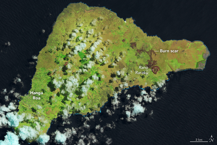 The blaze affected landscapes near Rano Raraku, an extinct volcanic crater on the eastern side of the island. The Operational Land Imager-2 (OLI-2) on Landsat 9 captured this natural-color image (right) of the burned area on October 12, 2022.