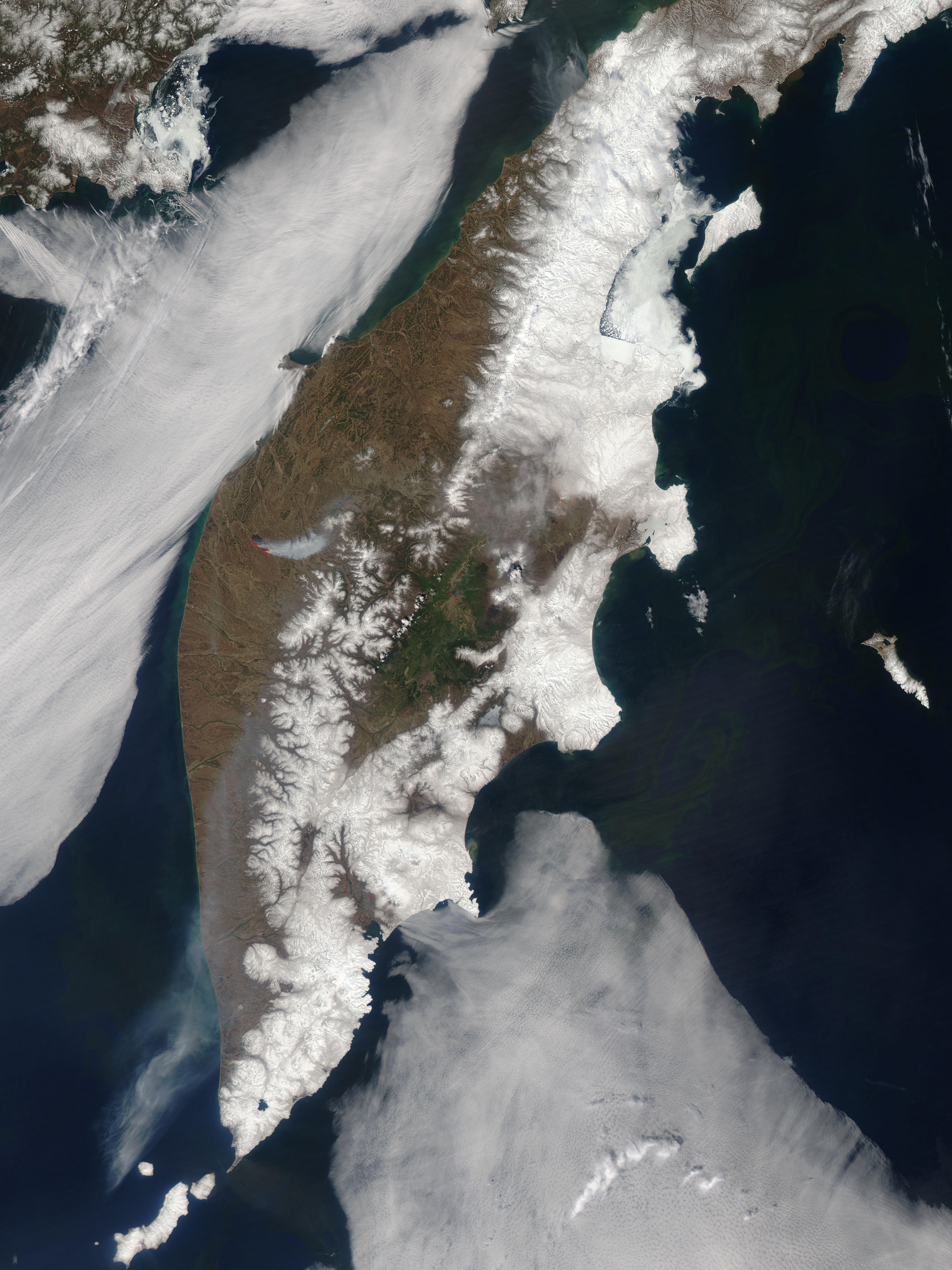 In this Moderate Resolution Imaging Spectroradiometer (MODIS) image from May 28, 2005, a large forest fire (marked in red) was burning on the western side of the peninsula. The smoke from the blaze stretched southward several hundred kilometers and spread into the Sea of Okhotsk. This is one of several large blazes burning in Russiaâs Far East. The high-resolution image shows additional fires on the peninsula.