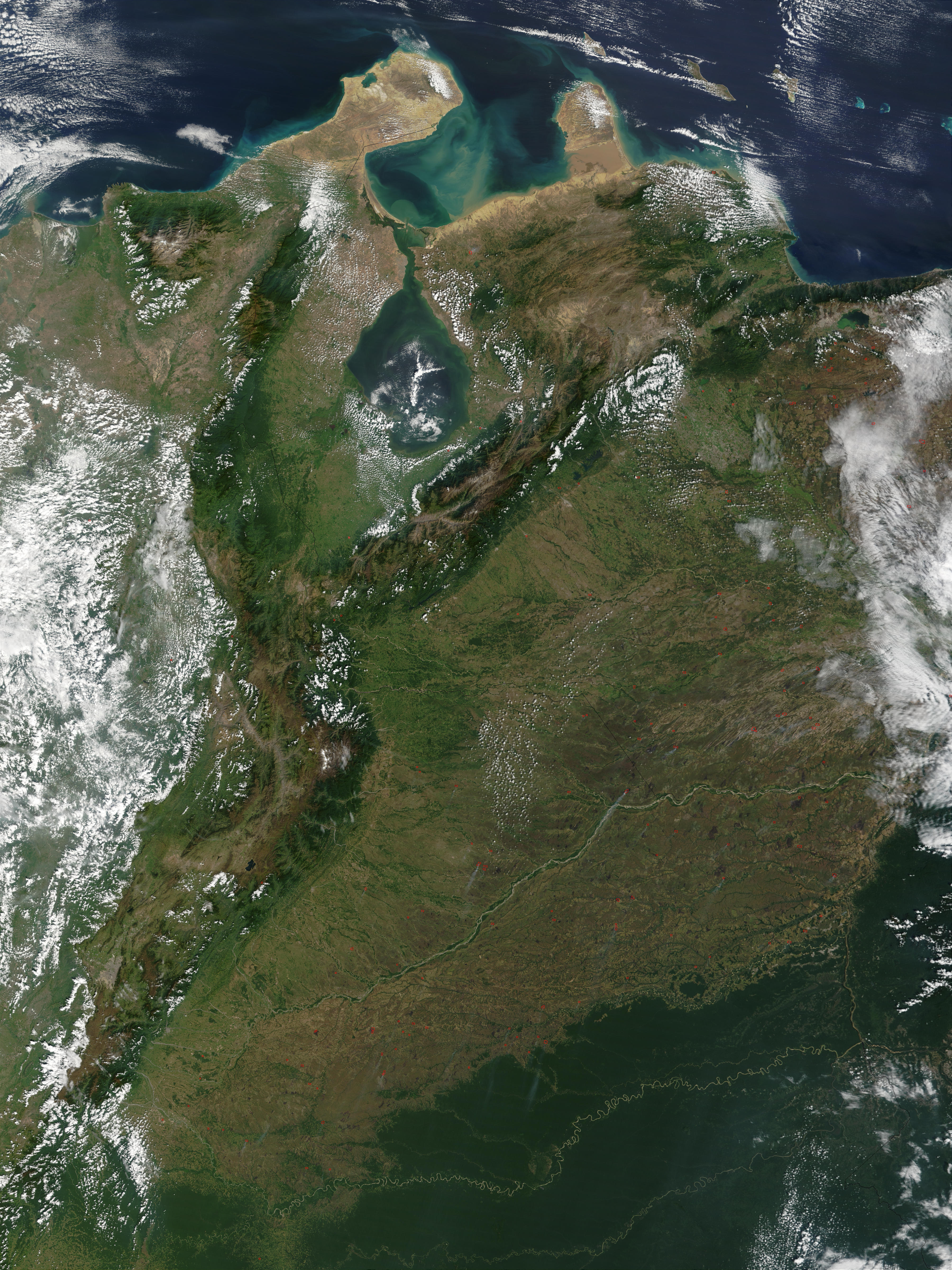Widespread biomass burning in northern South America that began in late 2002 has continued into the new year. This true-color Moderate Resolution Imaging Spectroradiometer (MODIS) image from the Terra satellite on January 4, 2003, shows active fire detections (red dots) in Columbia (left) and Venezuela (right).